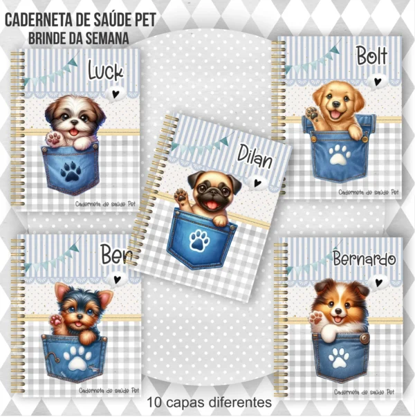 Este pacote digital completo oferece todos os recursos para a criação de cadernetas pet personalizadas para machos. Ideal para projetos de papelaria digital e produtos personalizados.