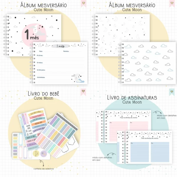 Um pacote completo e encantador para eternizar momentos especiais! ✨ Este combo digital inclui tudo o que você precisa para criar projetos personalizados com o tema Cute Moon, oferecendo opções em azul e rosa para atender a todos os gostos.