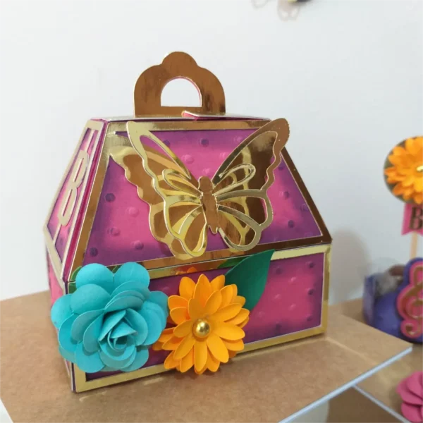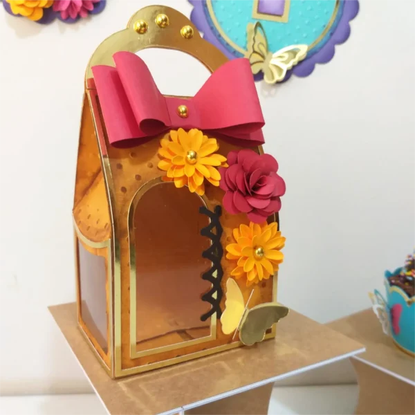 * 📂 **Caixa Cuttie:** Arquivos de corte em DXF e SVG, incluindo apliques (dourados, flores, laço). Inclui 2 arquivos PNG de pré-visualização.