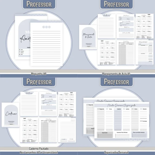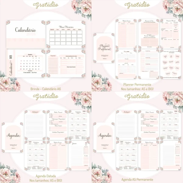 * 📂 **Planner A5:** Miolos completos em PDF, incluindo 12 meses, abas, divisórias e miolo final, além de um planner específico para professores 2026 (Parte 1).