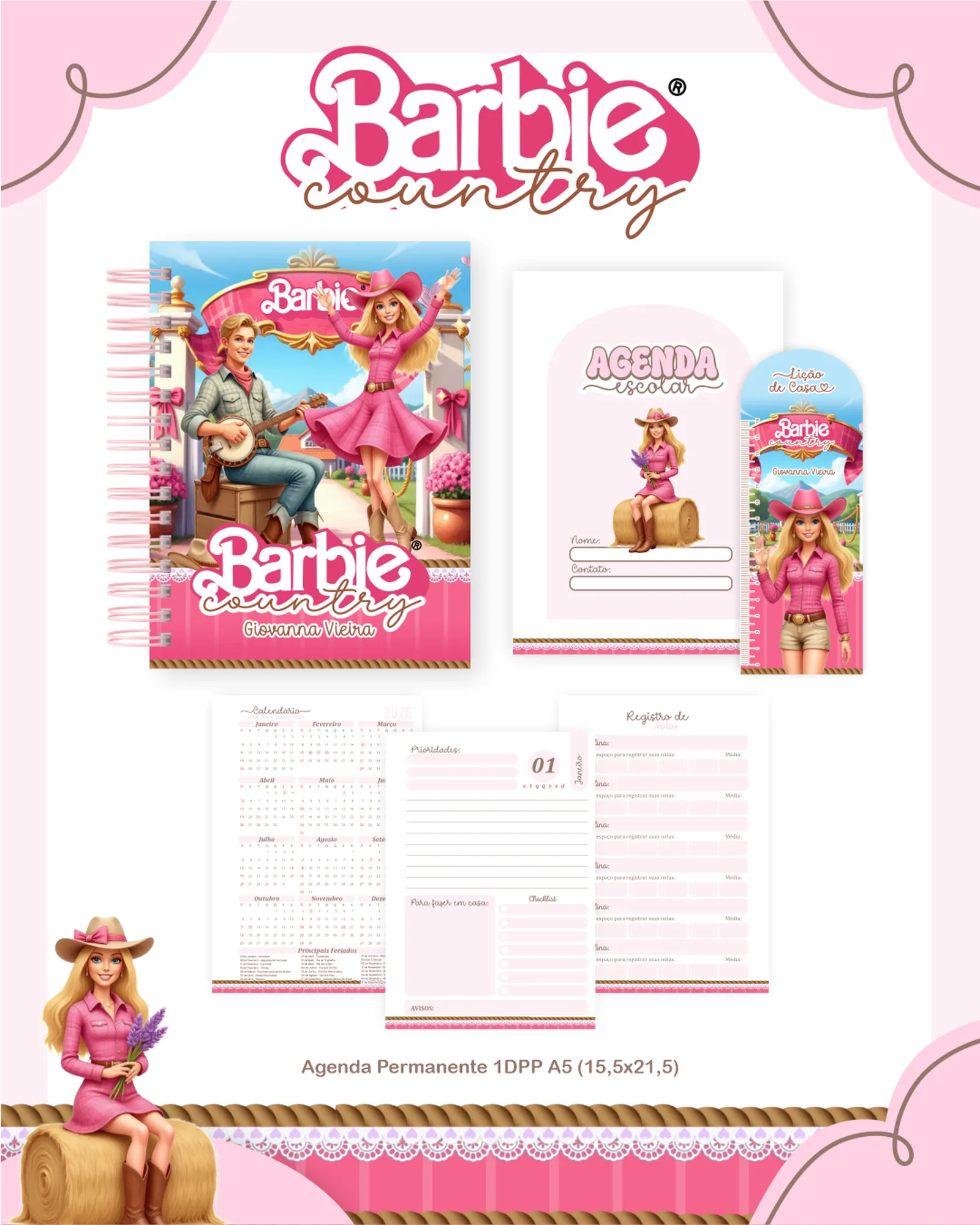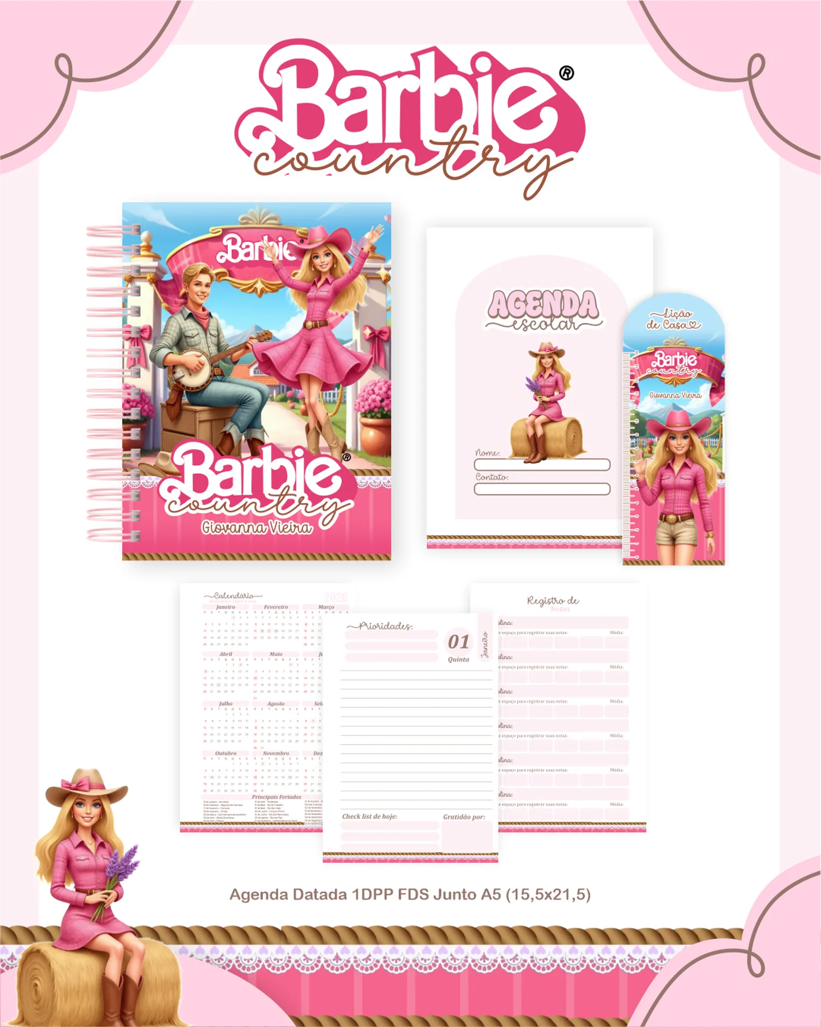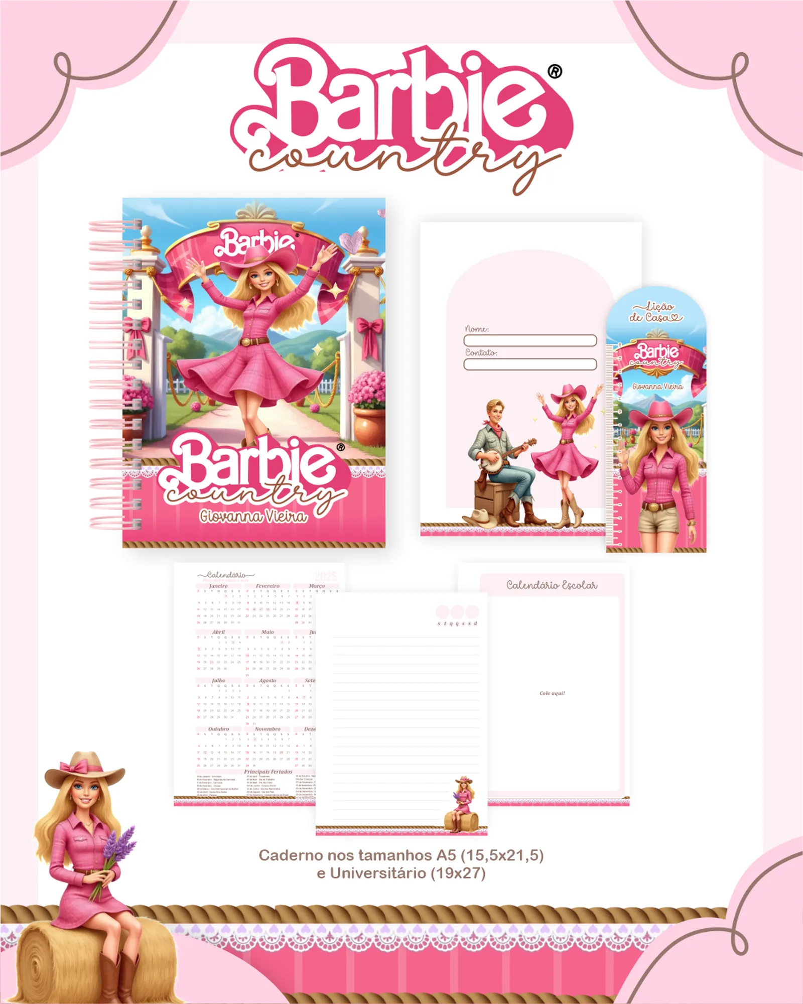 ✨ Apresentamos o incrível Pacote Digital “BARBIE COUNTRY”! ✨ Perfeito para quem ama criar materiais personalizados com um toque de charme e estilo. Este pacote completo inclui tudo o que você precisa para desenvolver agendas, cadernos, squeezes, etiquetas e muito mais, com a temática encantadora da Barbie no campo.