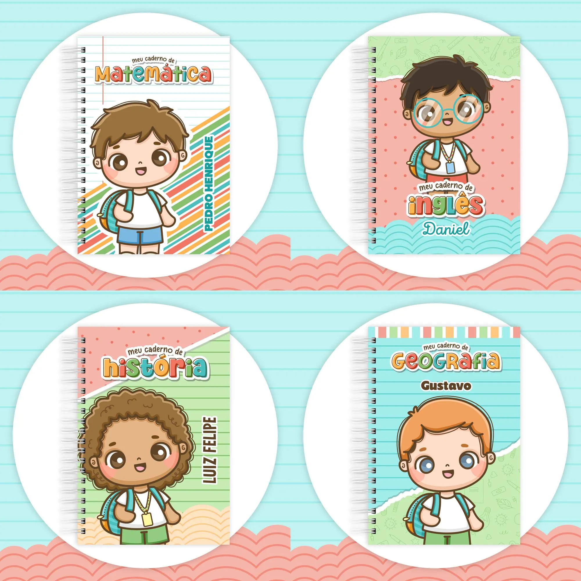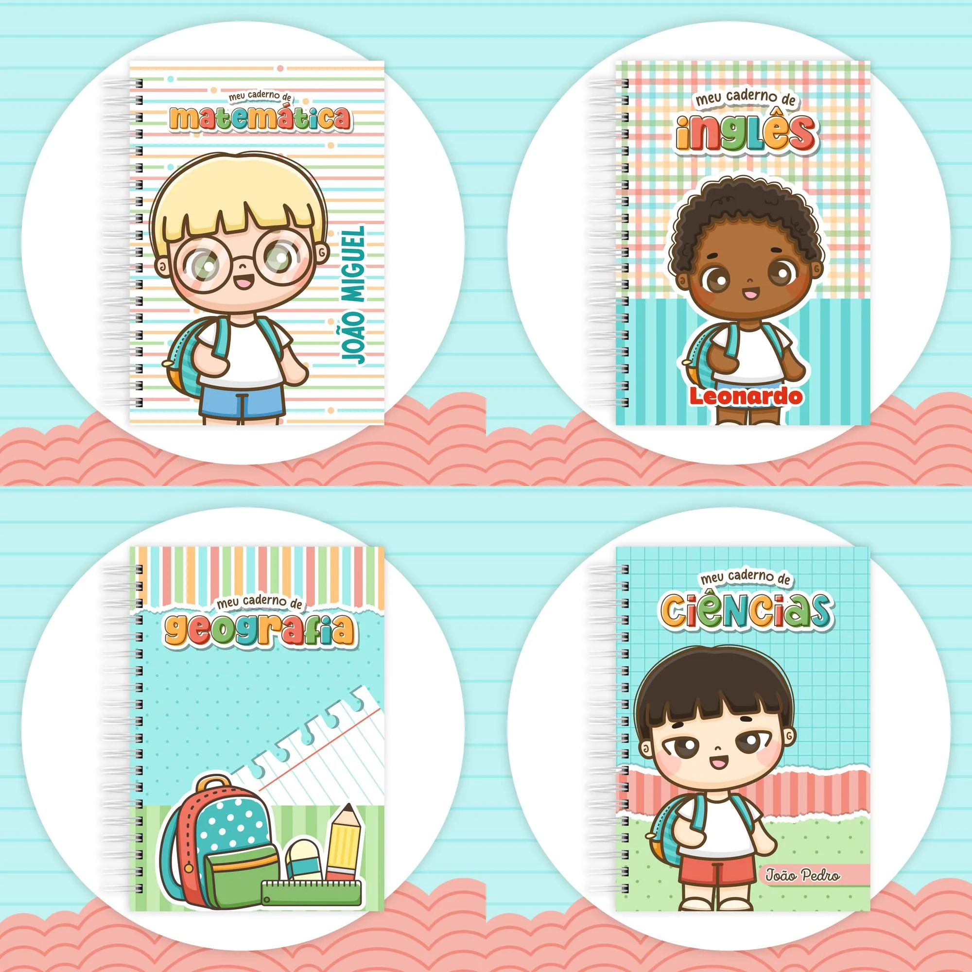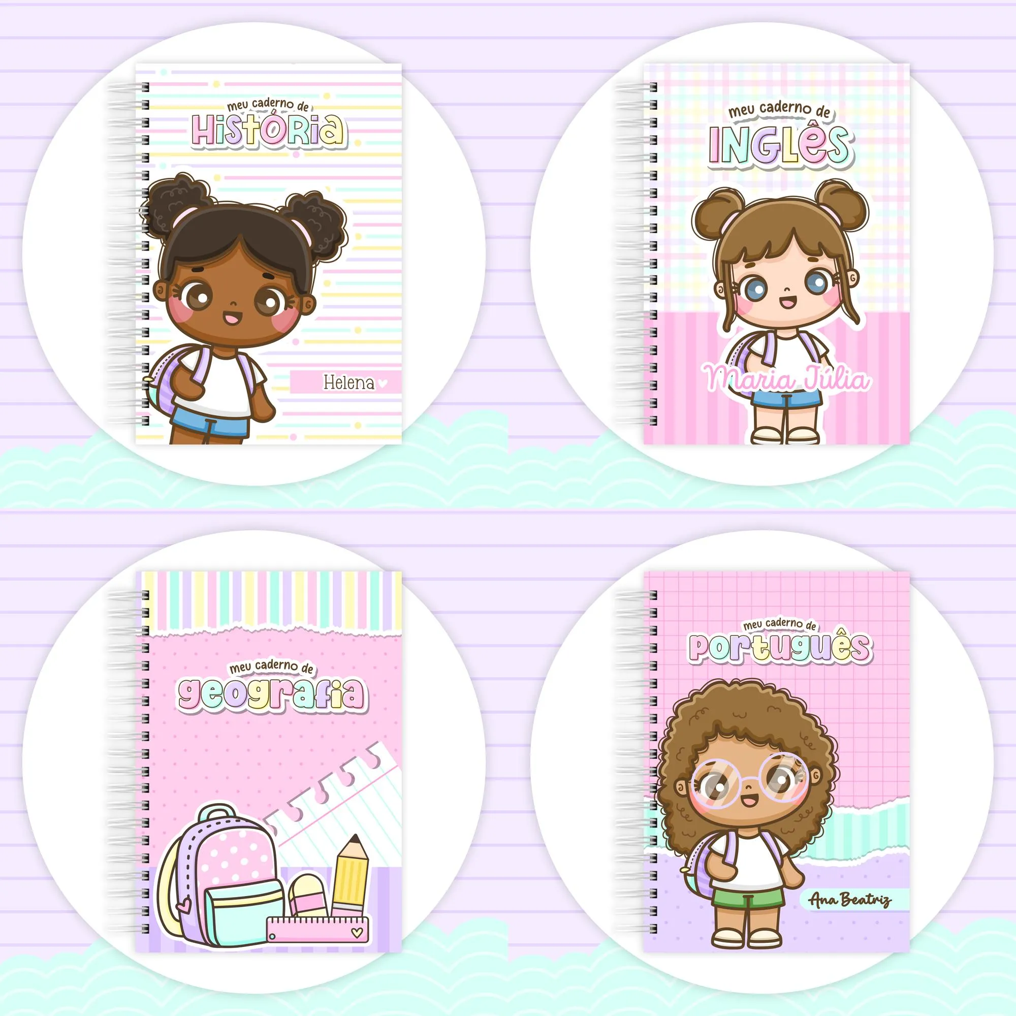 * **Pautado (PDF):** Miolos pautados nos tamanhos 14,8×14,8cm, 18x18cm, A5 e Universitário horizontal 18x26cm (menina, menino).
