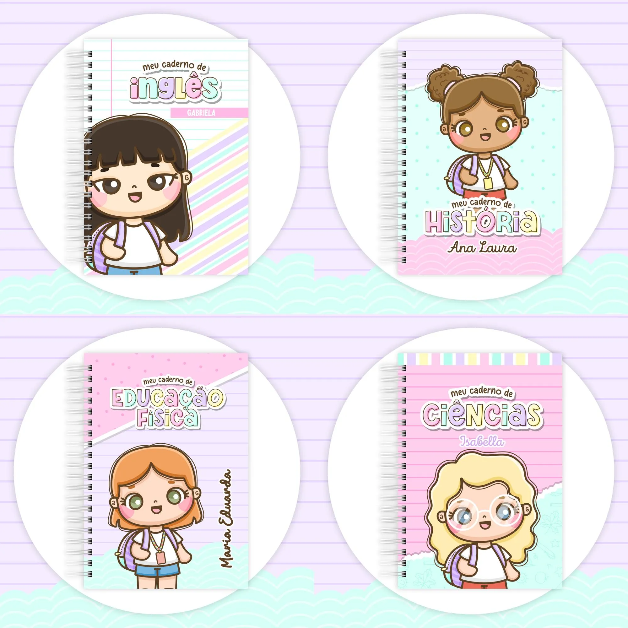 * **Divisória de Matéria (PDF, PNG):** Divisórias nos tamanhos 14,8×14,8cm, 18x18cm, A5 e Universitário 18x26cm (menina, menino), com arquivos PDF e mais de 16 arquivos PNG.
