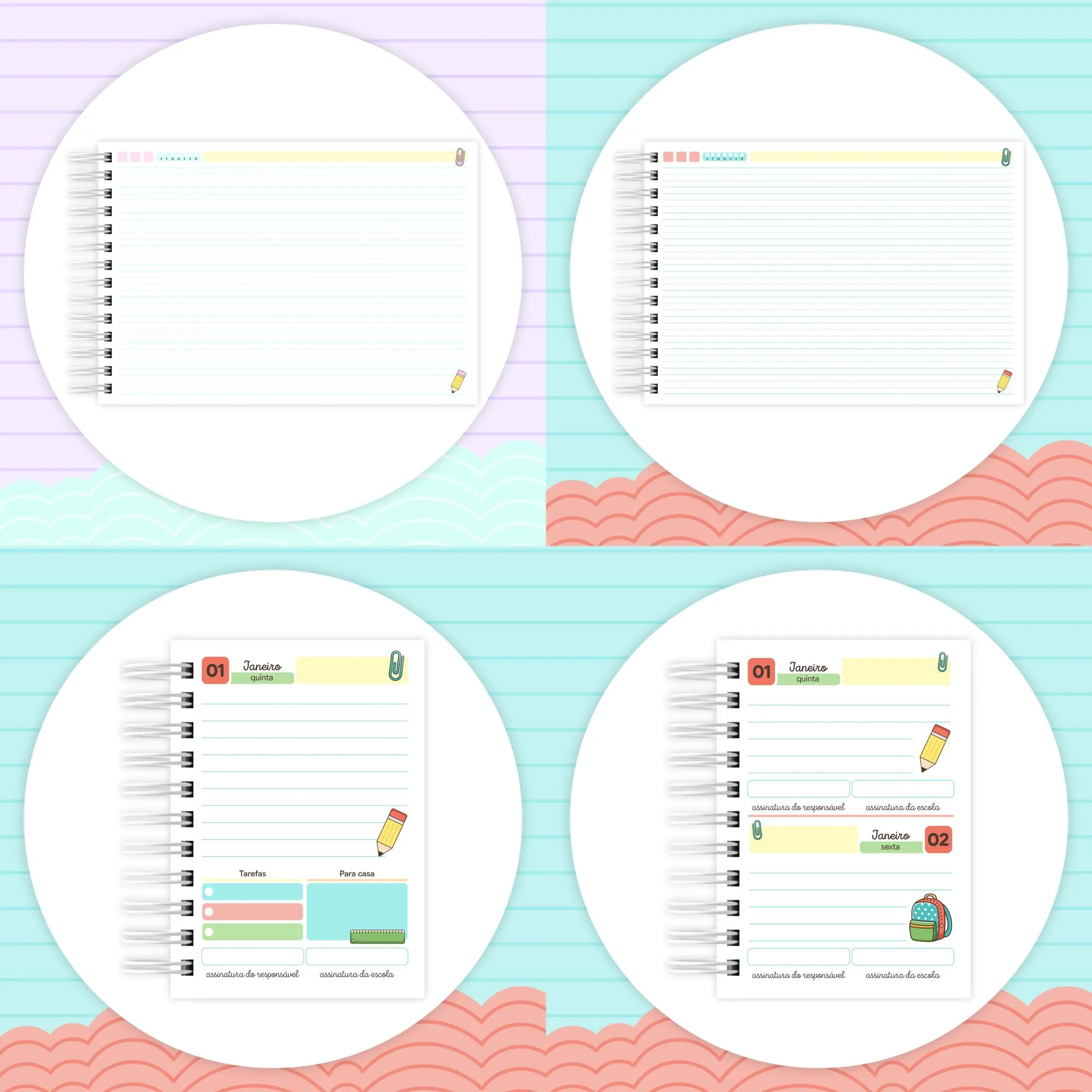 * **🎨 Capas (PDF, PNG):** Mais de 8 arquivos PDF de capas prontas para impressão e diversos arquivos PNG para fundos, para Agendas de Creche e Escolares em variados tamanhos (14,8×14,8cm, 18x18cm, A5, A6, Universitário).