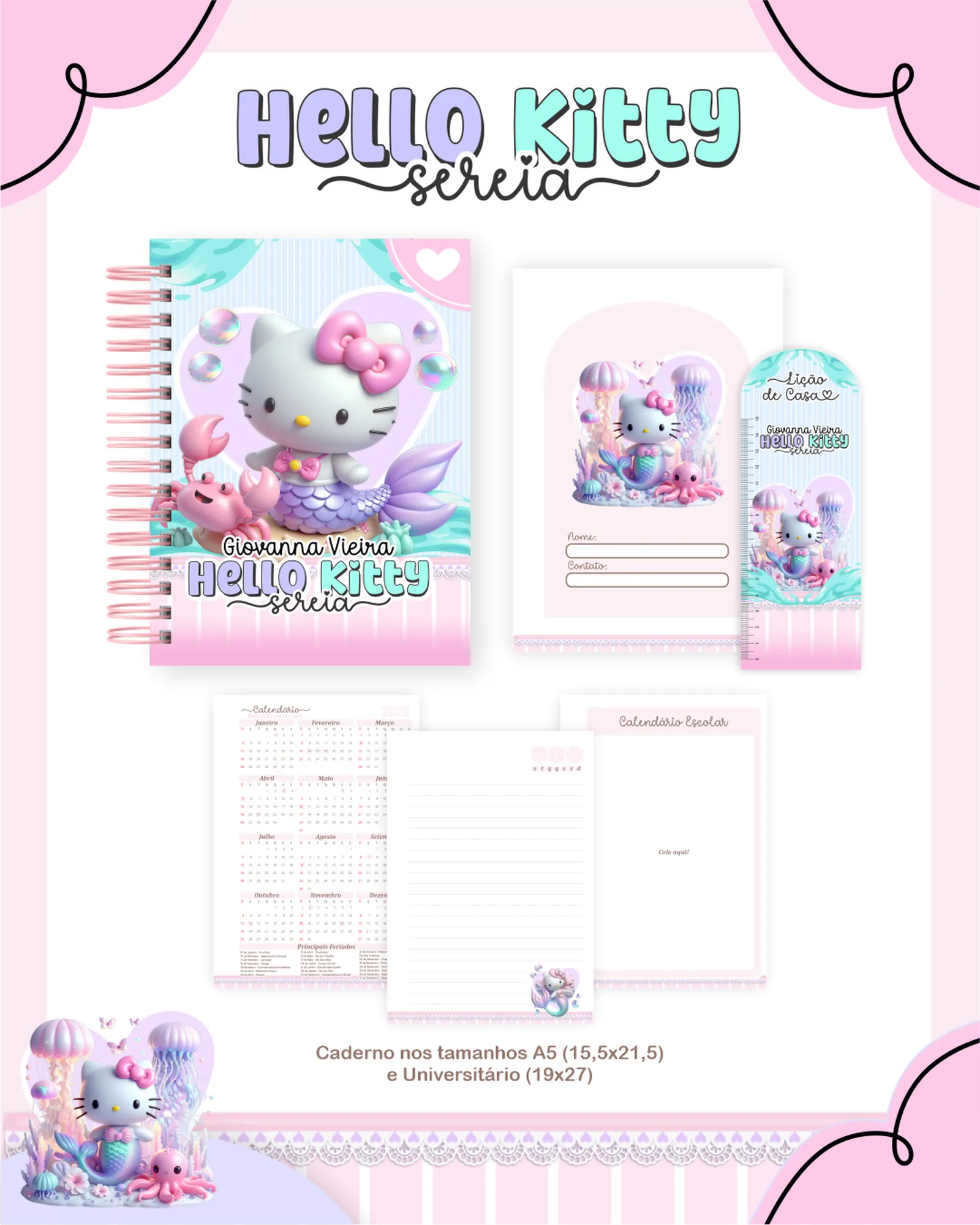 Este pacote digital completo oferece uma variedade de arquivos prontos para impressão e personalização, perfeito para projetos de papelaria e encadernação com o tema Hello Kitty Sereia!