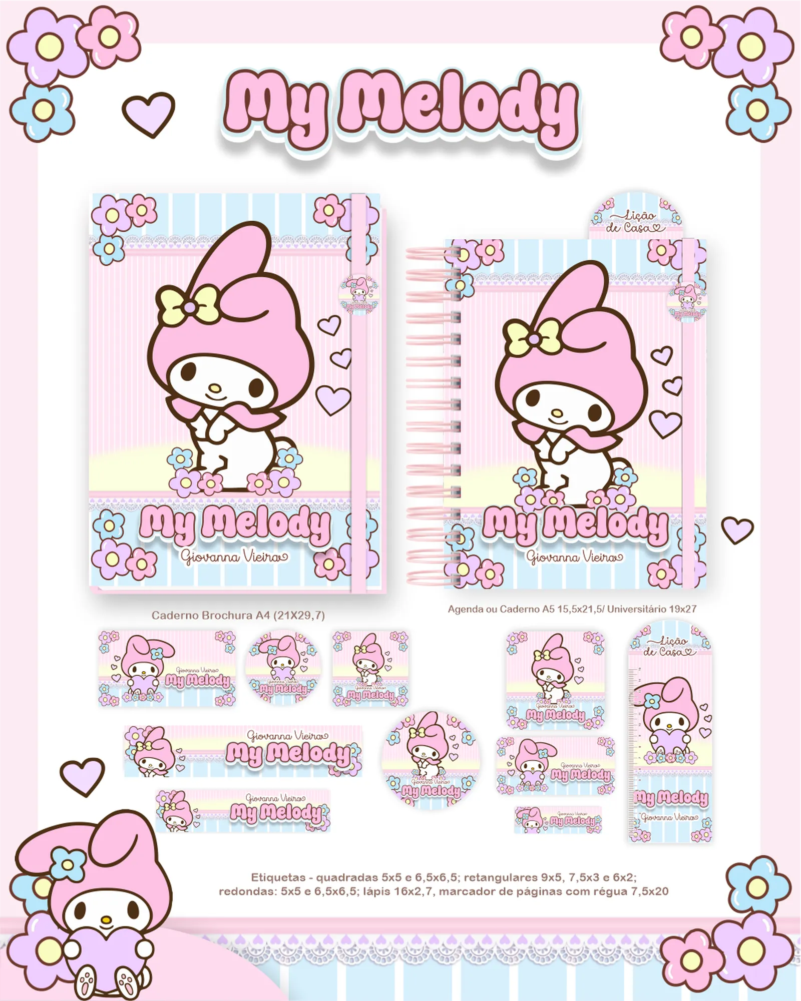 Este pacote digital exclusivo é perfeito para quem busca criar produtos personalizados e de alta qualidade com o tema My Melody! 🎀 Ele contém uma variedade de arquivos prontos para impressão e personalização, organizados para facilitar seu trabalho.