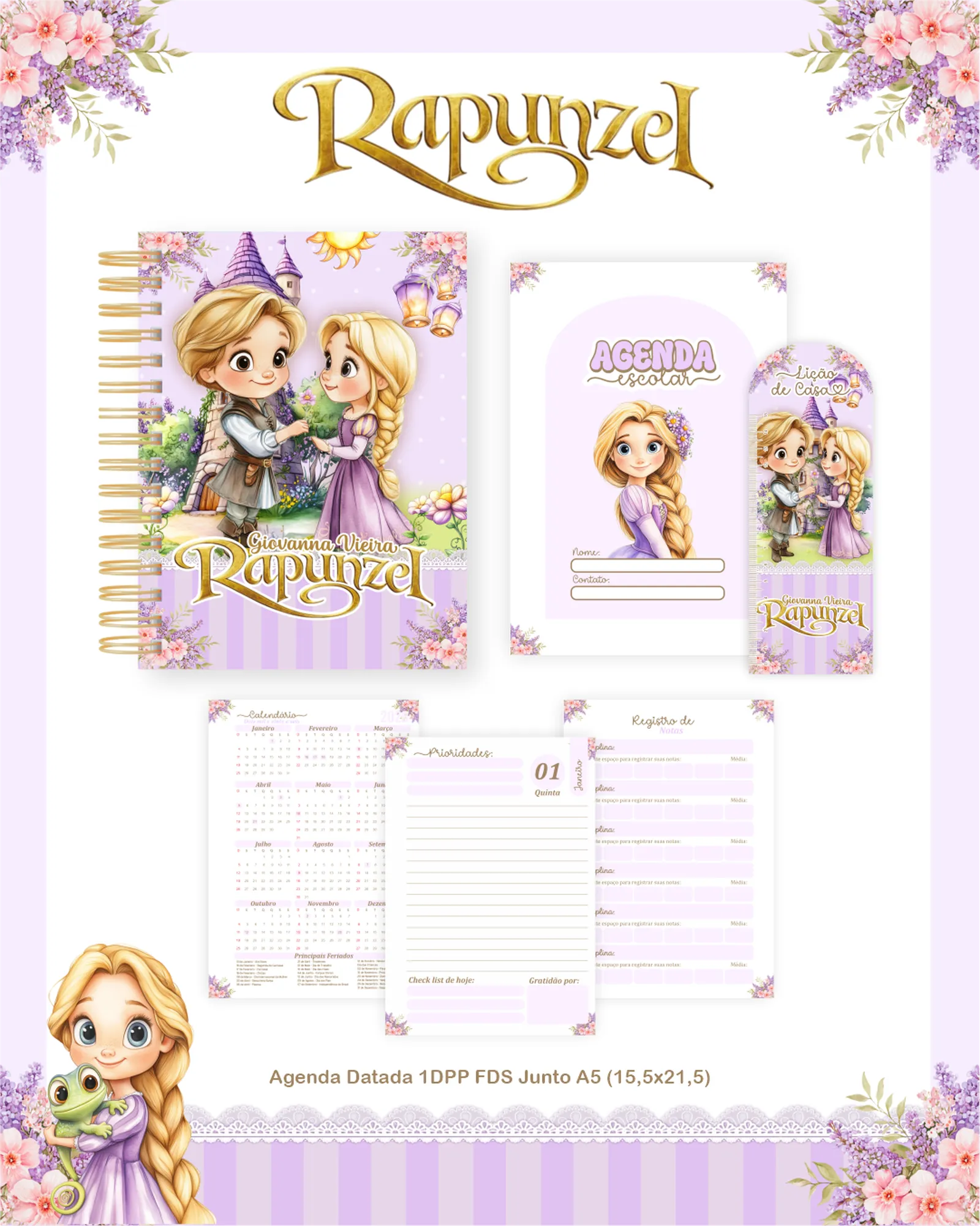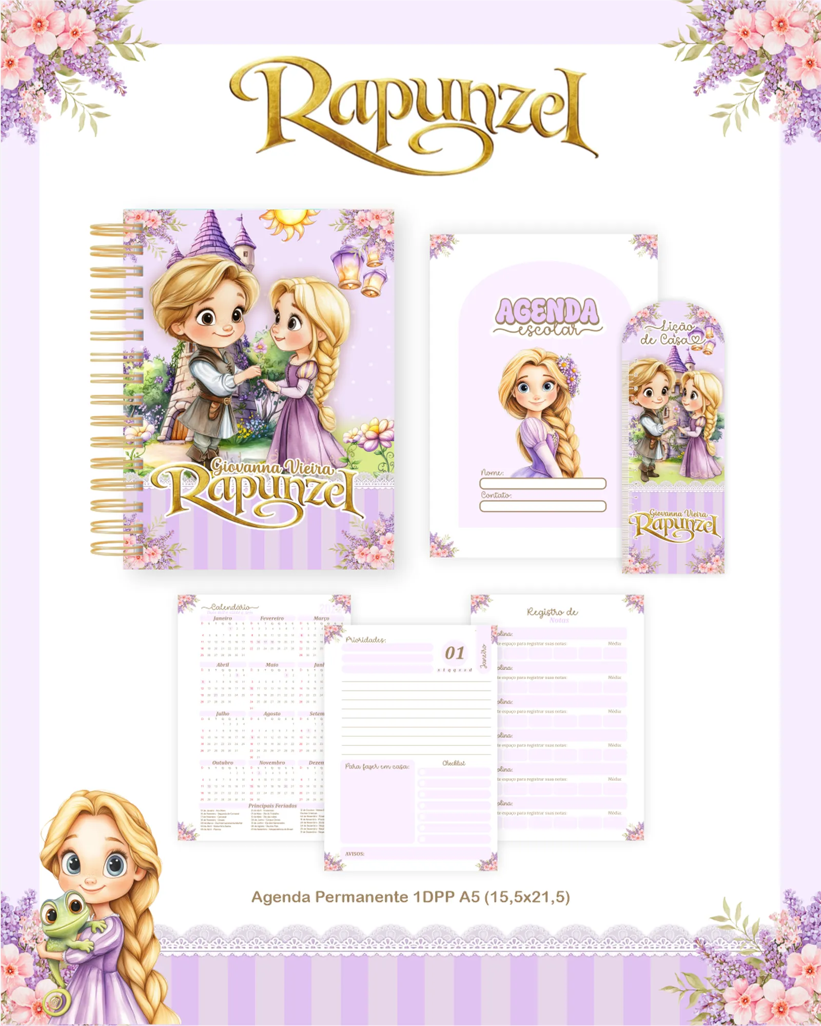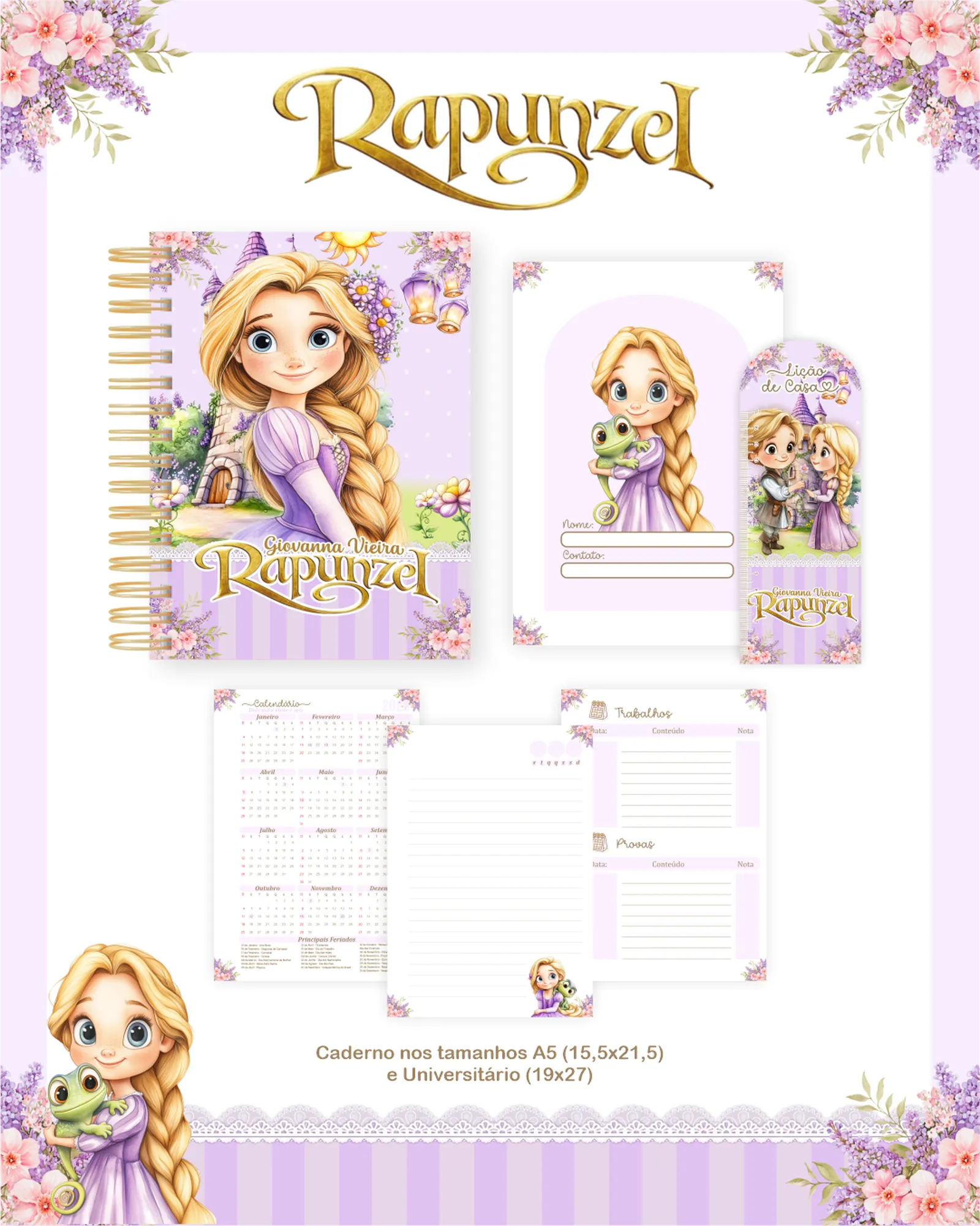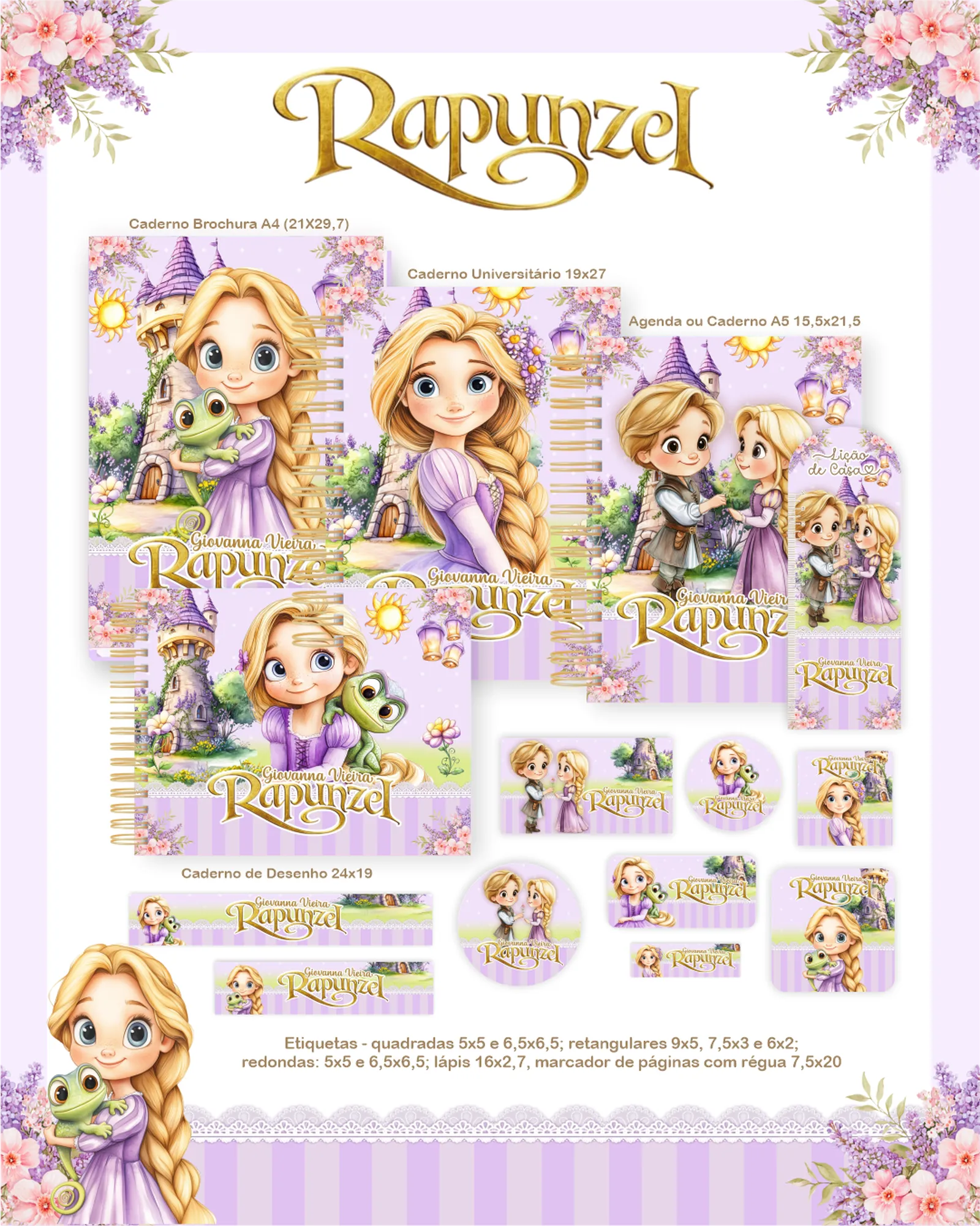 ✨ Apresentamos um pacote digital completo e encantador com o tema da Rapunzel 👑, perfeito para criadores e artesãos que desejam desenvolver uma linha exclusiva de produtos escolares e de papelaria. Este kit versátil oferece designs prontos para impressão e elementos personalizáveis, ideal para agendas, cadernos, squeezes, réguas e muito mais!