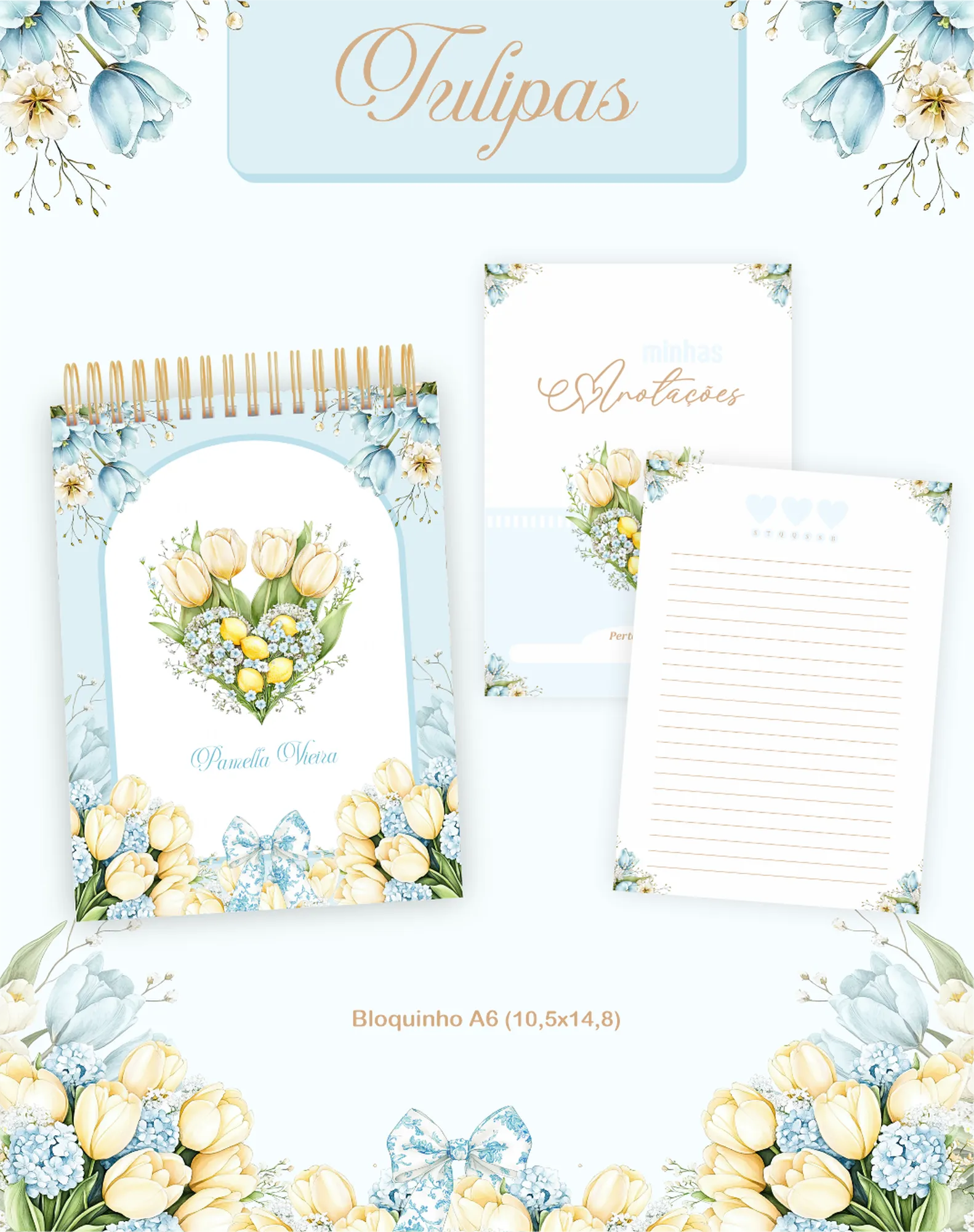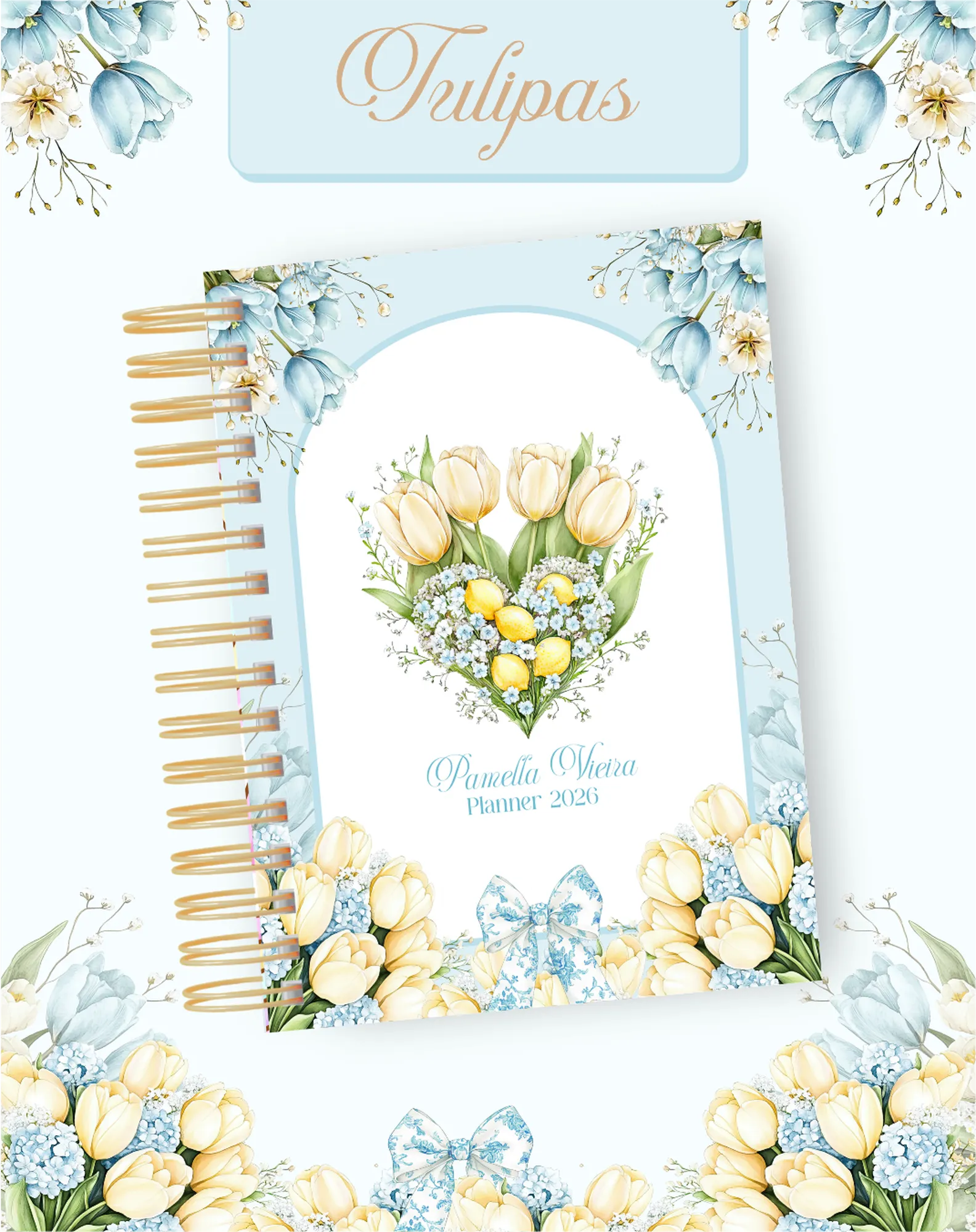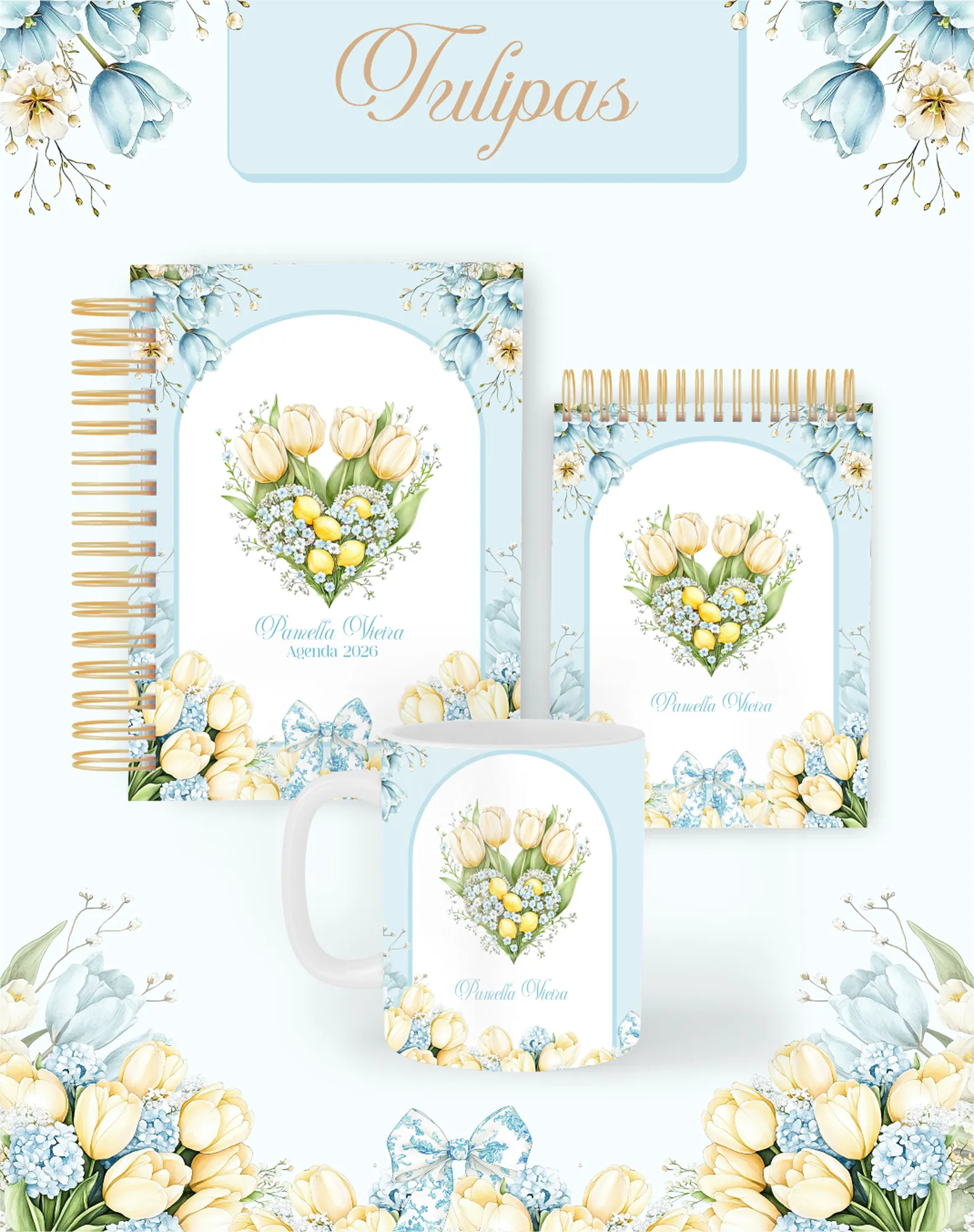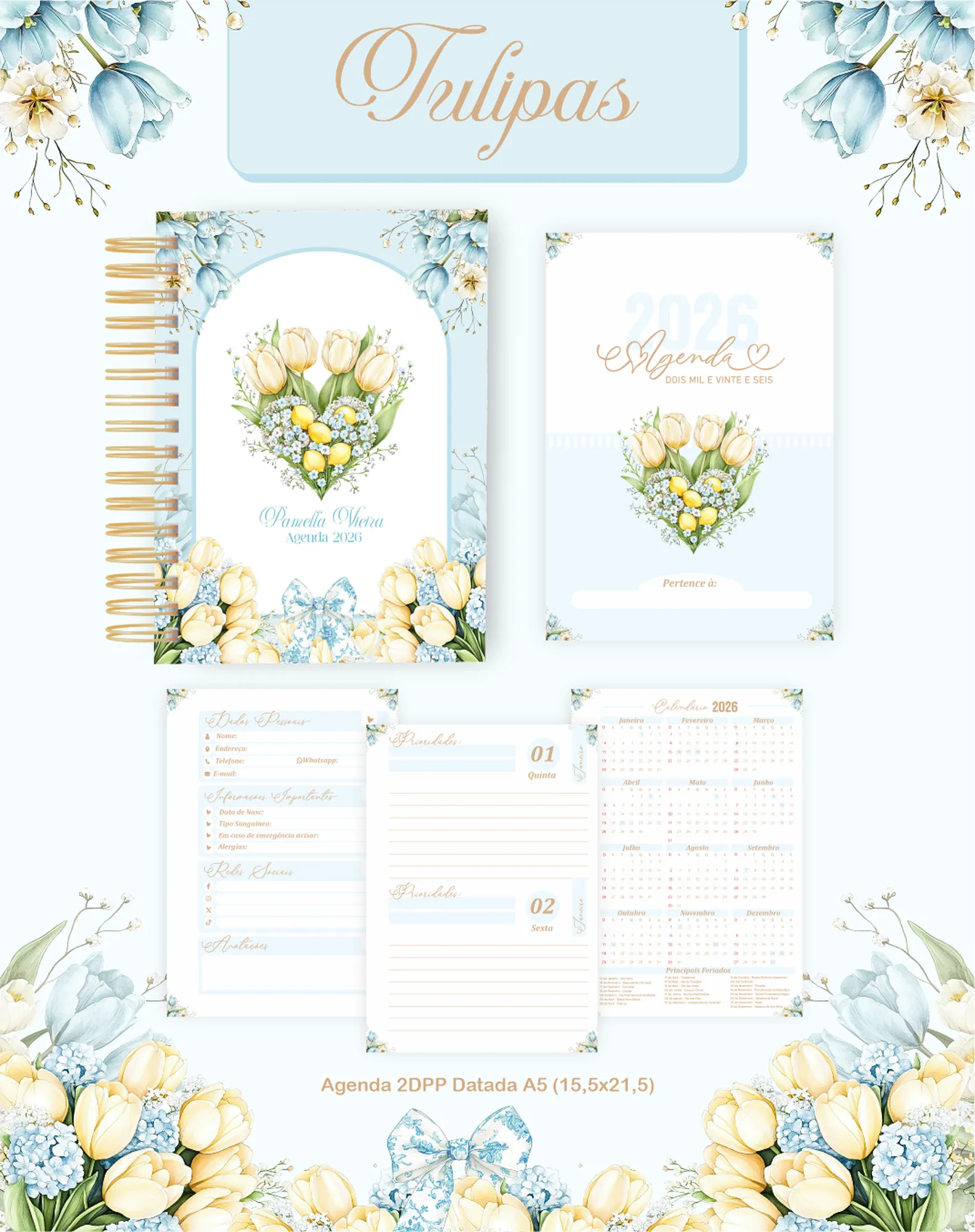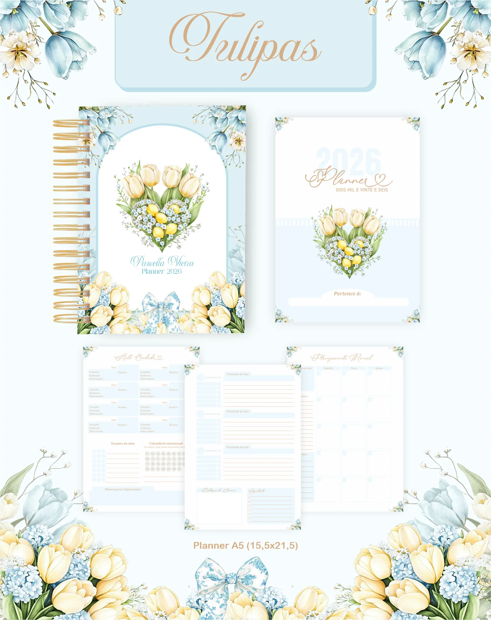 Este pacote digital exclusivo oferece uma coleção completa para criar produtos personalizados com o tema “Tulipas”, perfeito para 2026 e uso permanente. Inclui miolos de agendas e planners, capas, elementos gráficos, fontes e mockups para divulgar seus produtos.