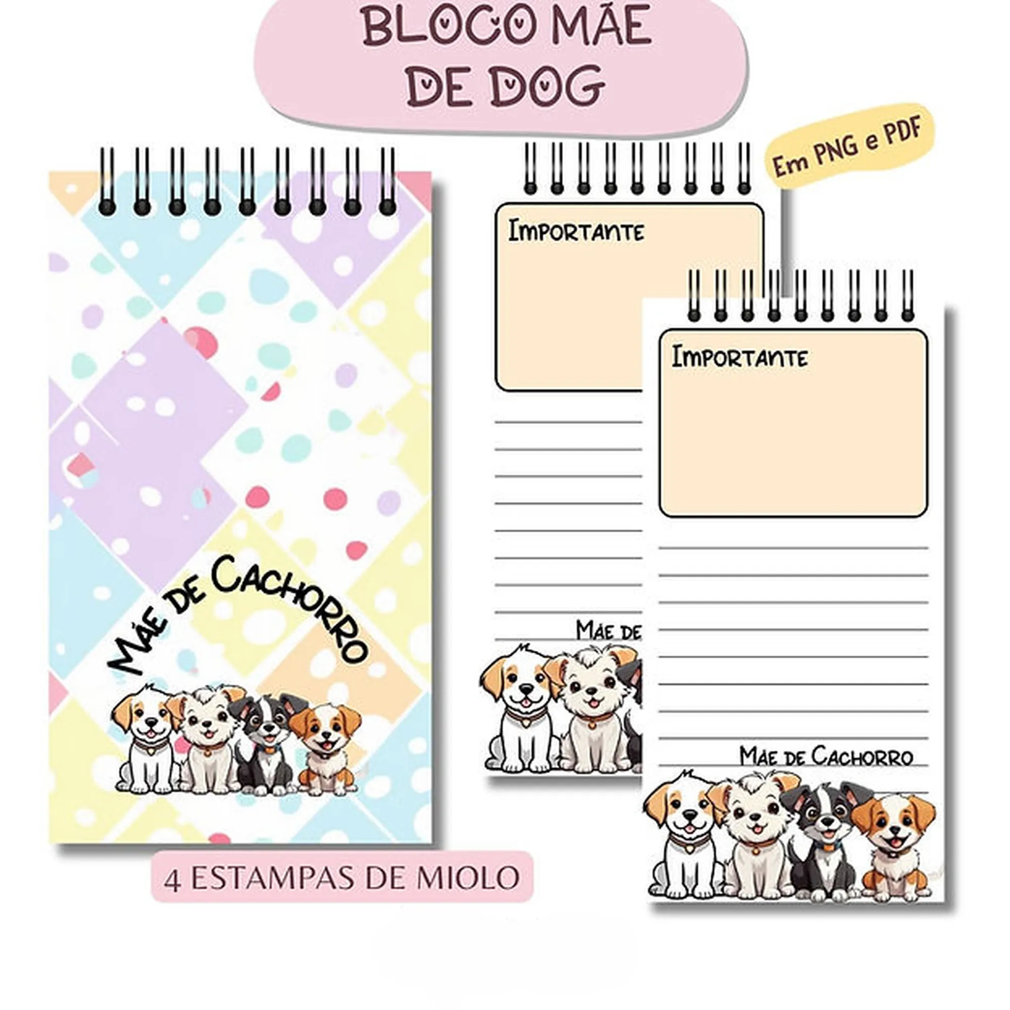 Este pacote digital exclusivo é perfeito para quem ama pets e quer criar bloquinhos de anotações personalizados e encantadores com o tema “Mãe de Dog”! Ideal para uso pessoal, presentes ou para agregar valor aos seus produtos de papelaria.