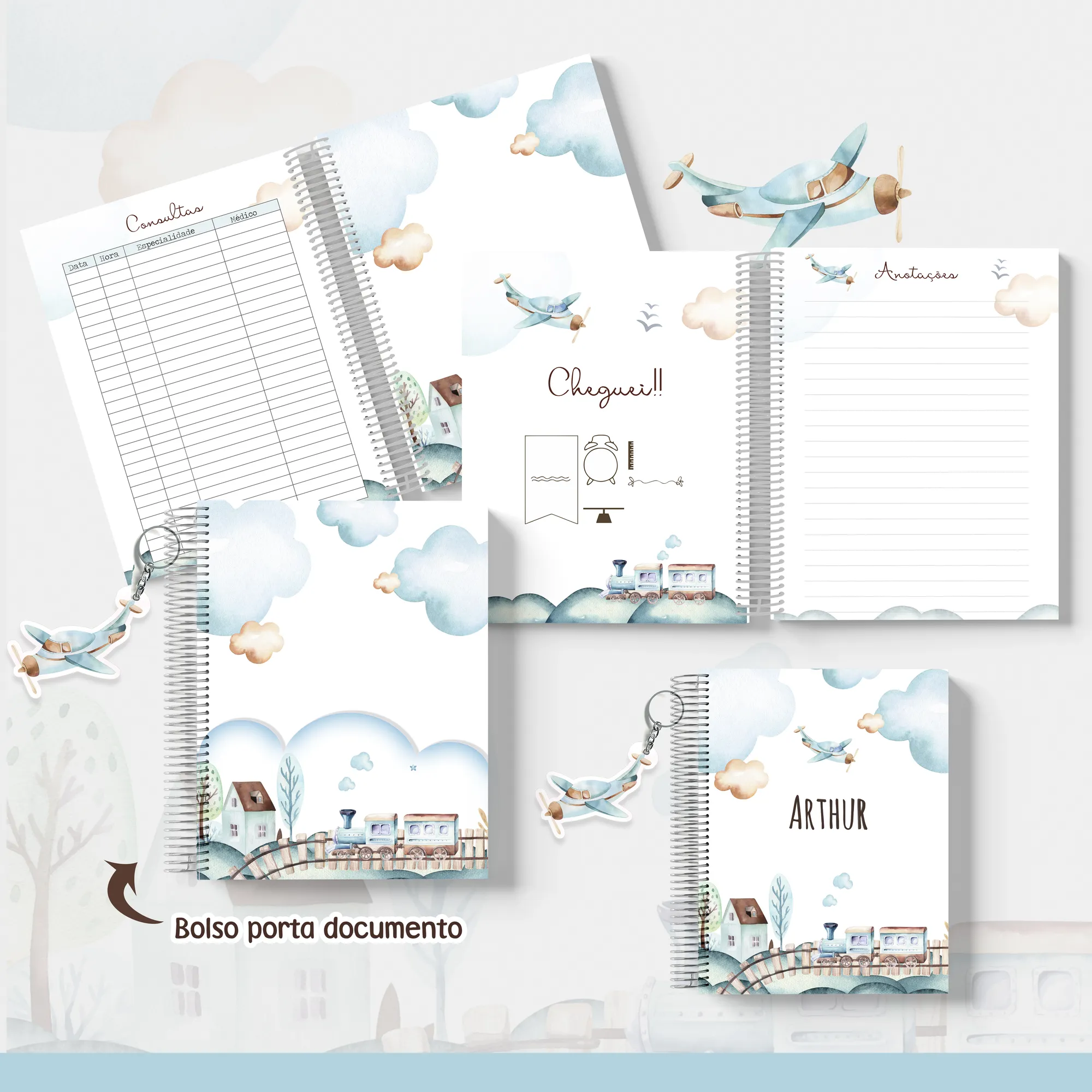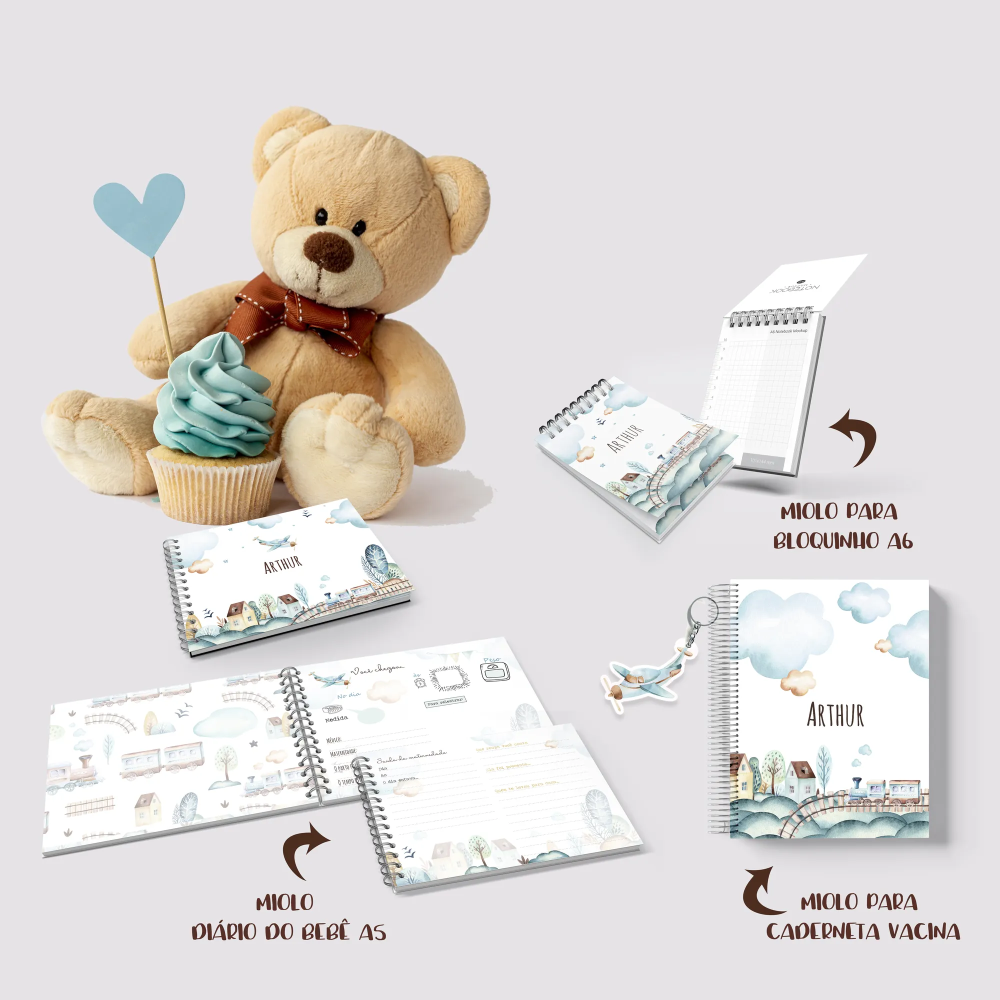 Prepare-se para encantar com o **COMBO MEU MUNDO AZUL**! 💙 Um pacote digital completo e super fofo, perfeito para celebrar a chegada e os primeiros anos do seu pequeno príncipe. Com design delicado e elementos aquarelados de trenzinhos e aviõezinhos, este combo é ideal para criar produtos personalizados e memoráveis.