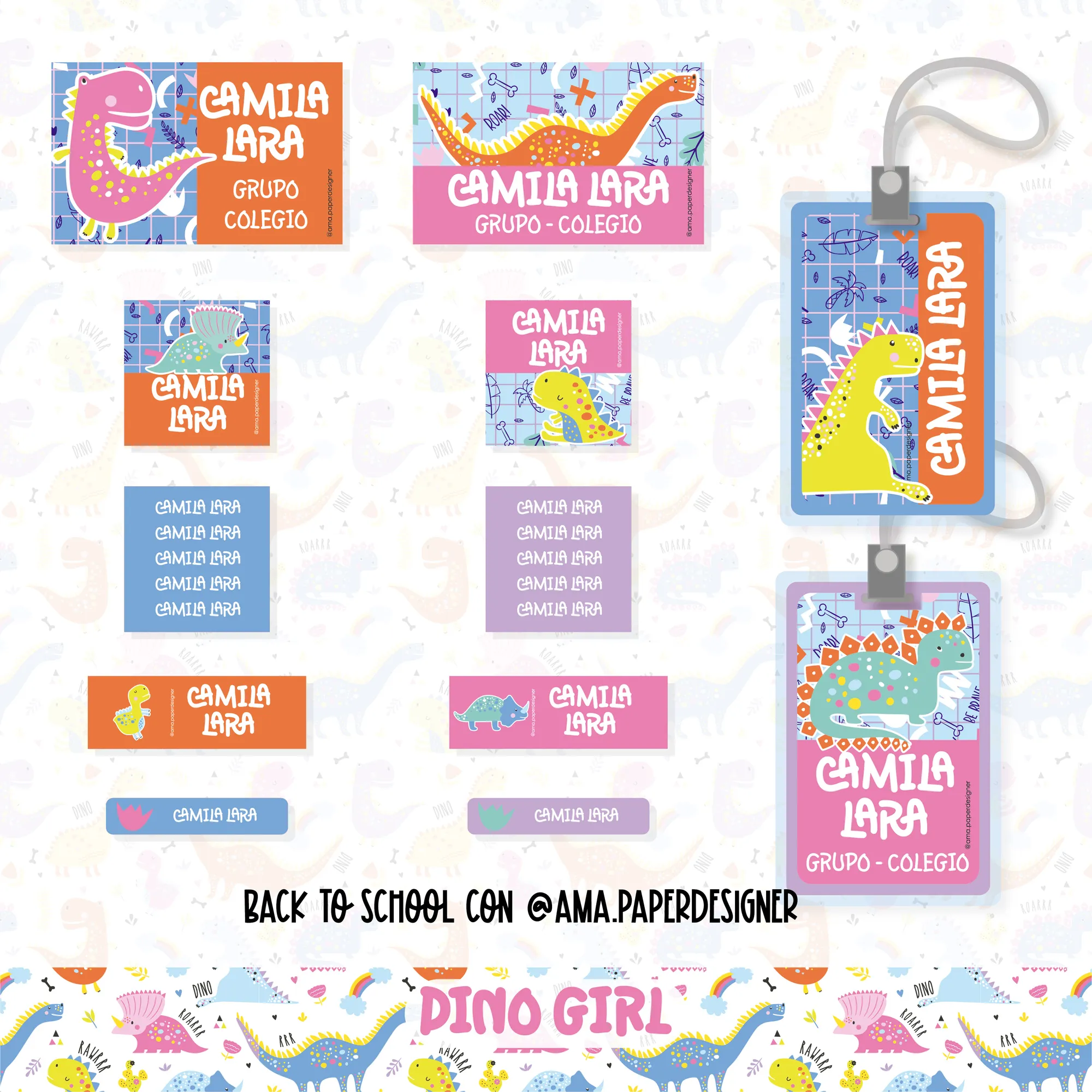 * Uma coleção encantadora de elementos com o design “AMA-DINO GIRL”, ideal para etiquetas, adesivos e decorações. Cada item possui duas variações (A e B):