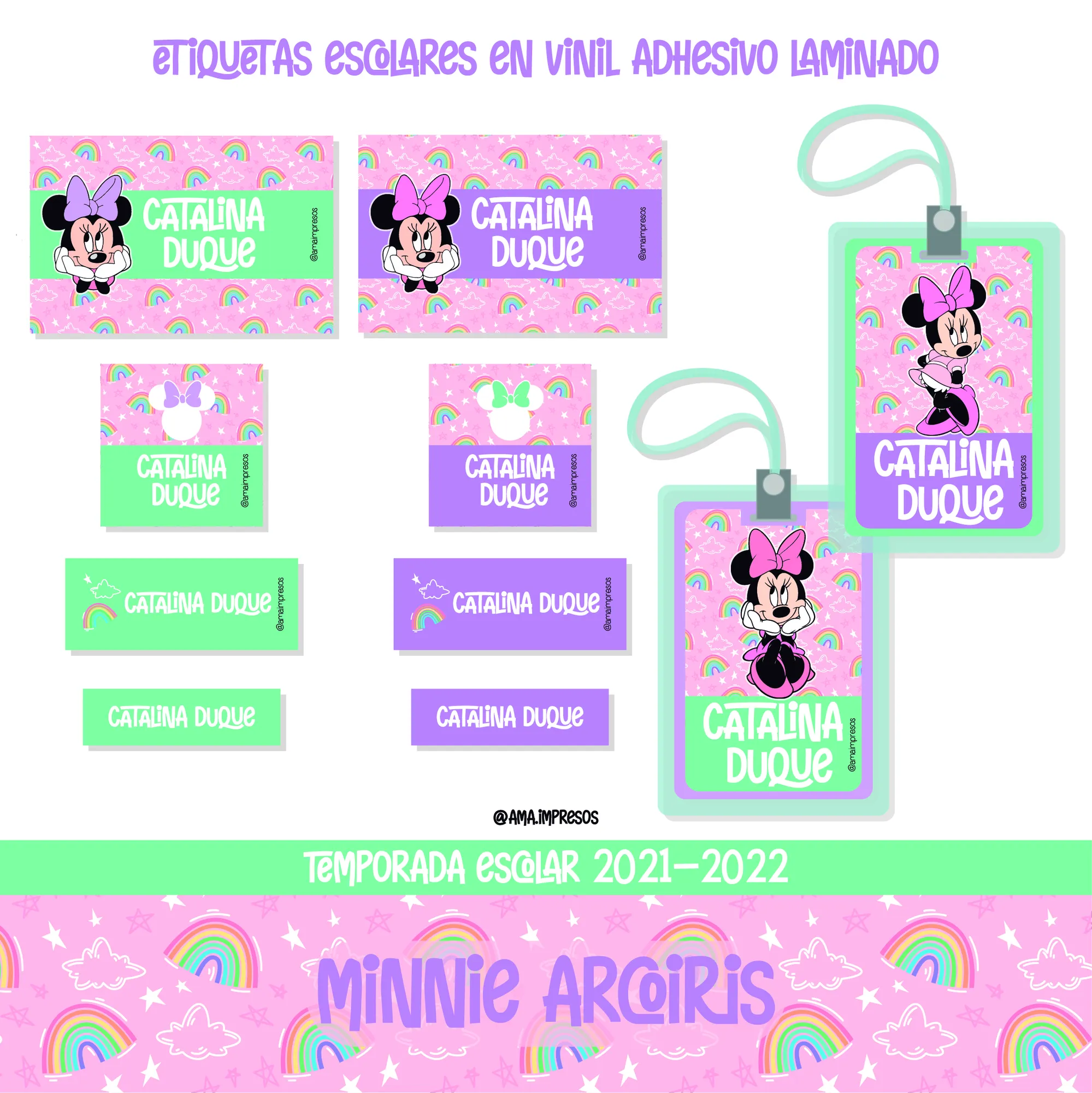 * **Mockup (JPG)**: 1 arquivo em formato JPG para visualização e divulgação do seu projeto de etiqueta escolar Minnie Arco-Íris.