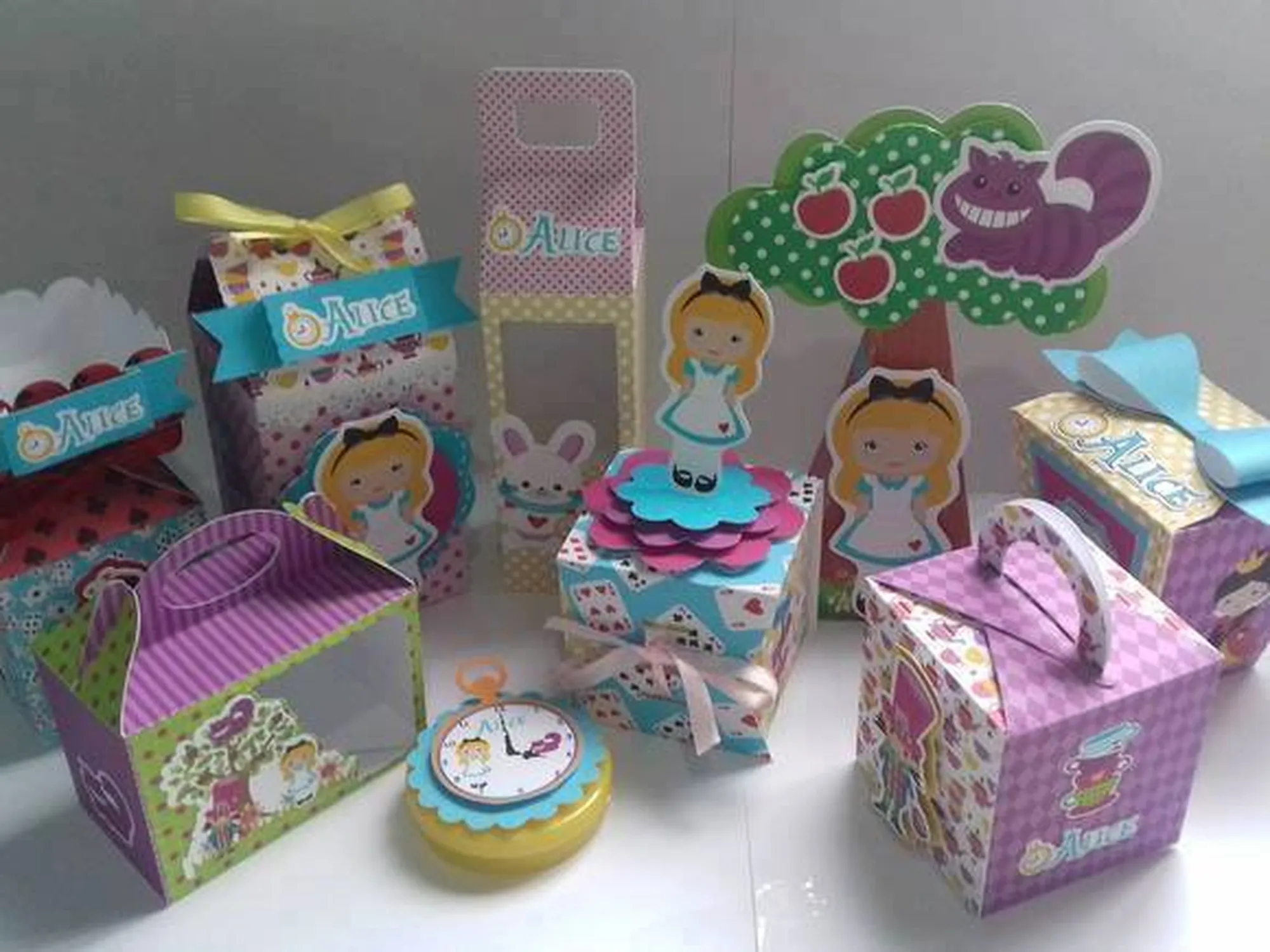 * 🎁 **CAIXA COM ALÇA ALICE NO PÁIS DAS MARAVILHAS:** Uma caixa prática e linda para lembrancinhas.