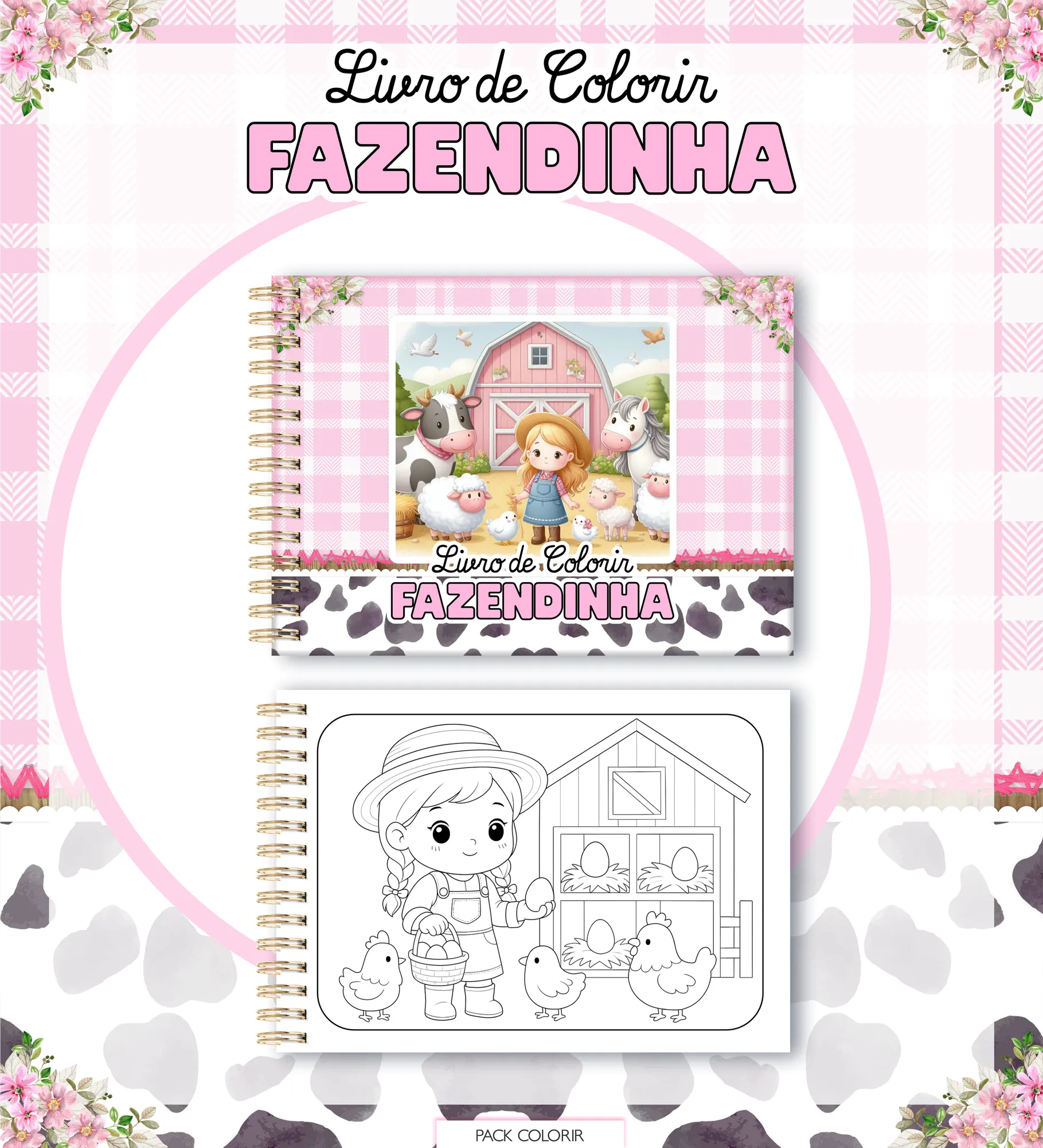 * 40 páginas para colorir (PNG) com ilustrações encantadoras da fazendinha.