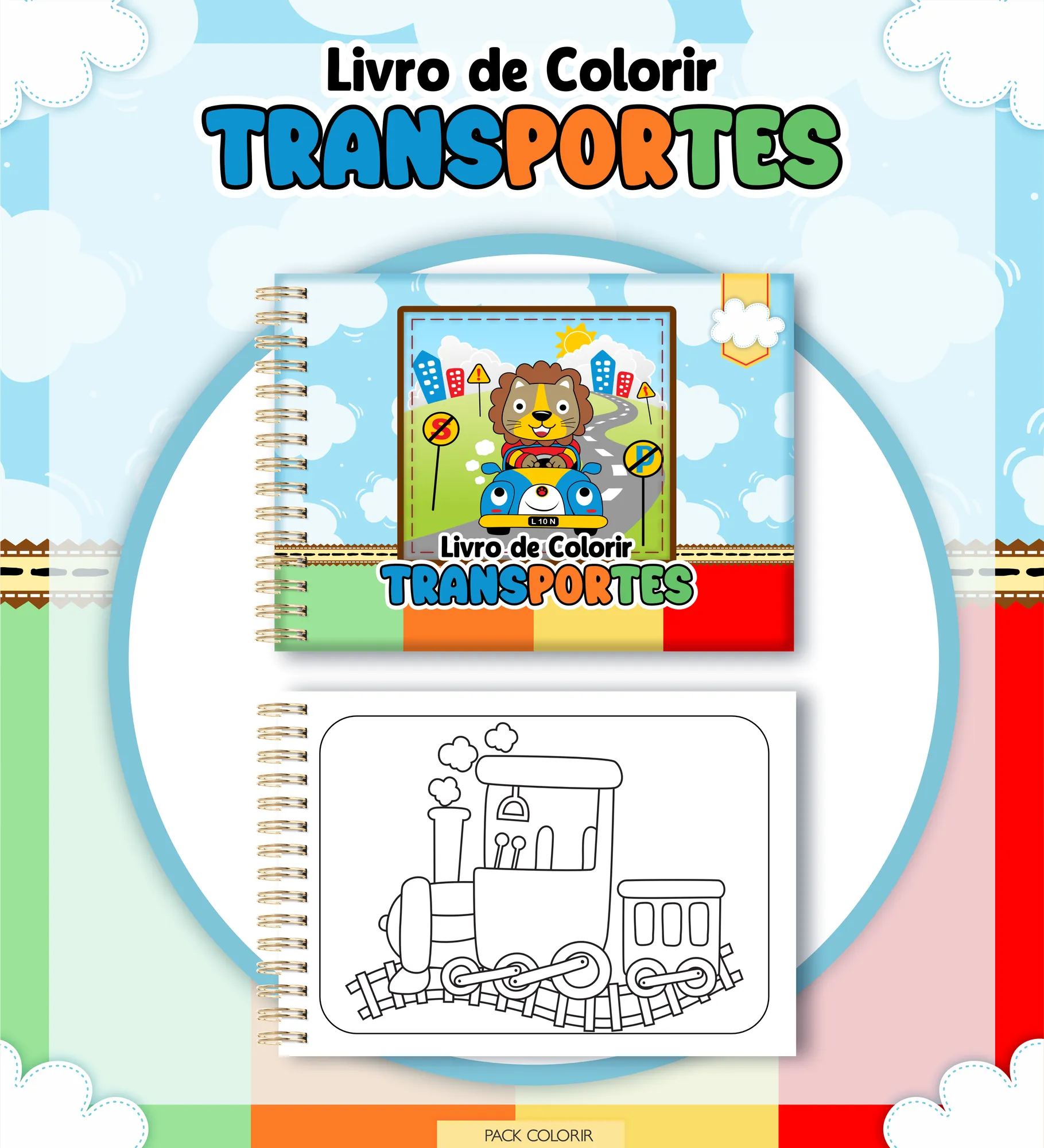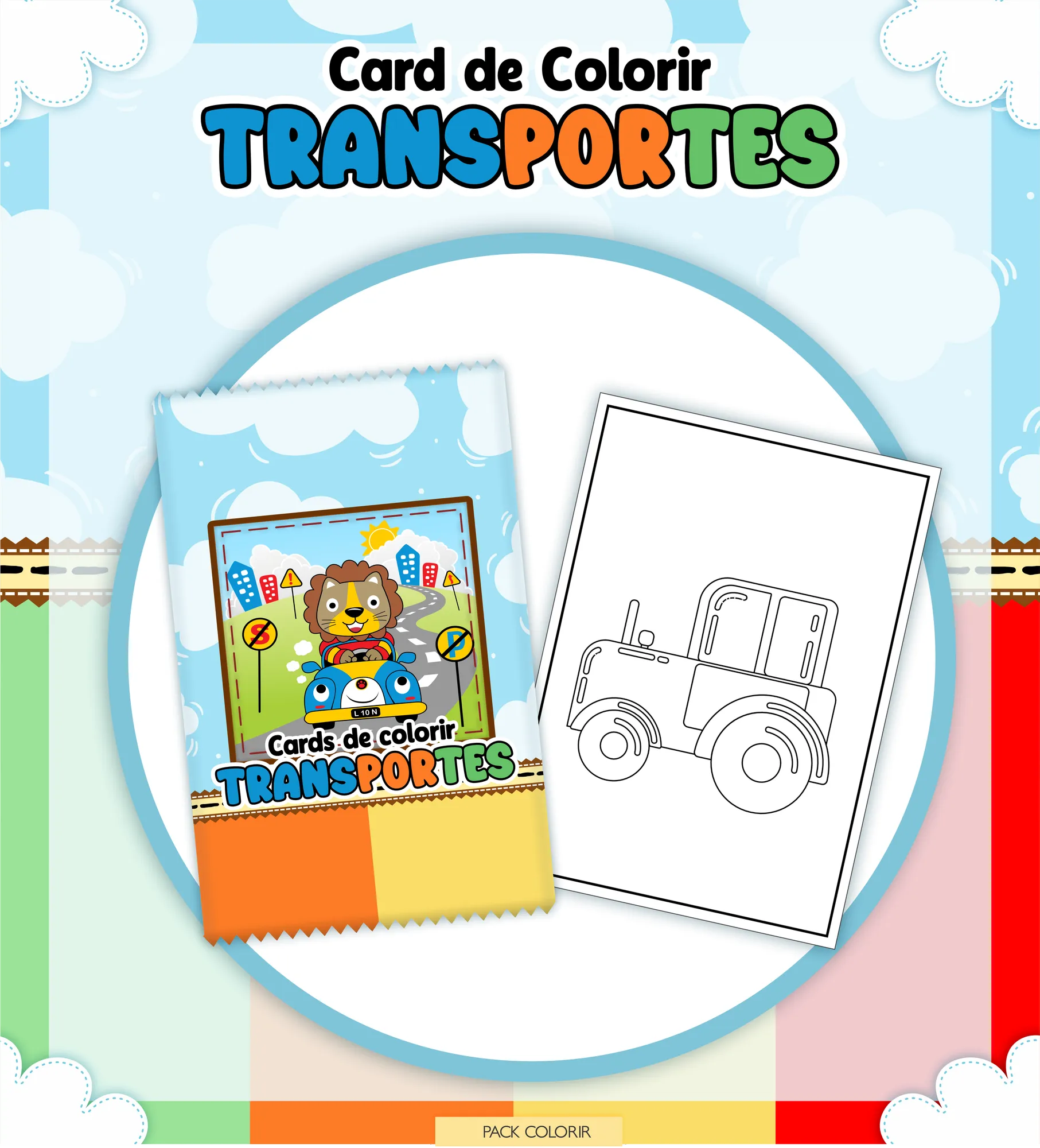 Prepare-se para uma jornada criativa com este pacote digital completo, perfeito para desenvolver livros de colorir, cards e estojos personalizados com o tema Meios de Transporte!