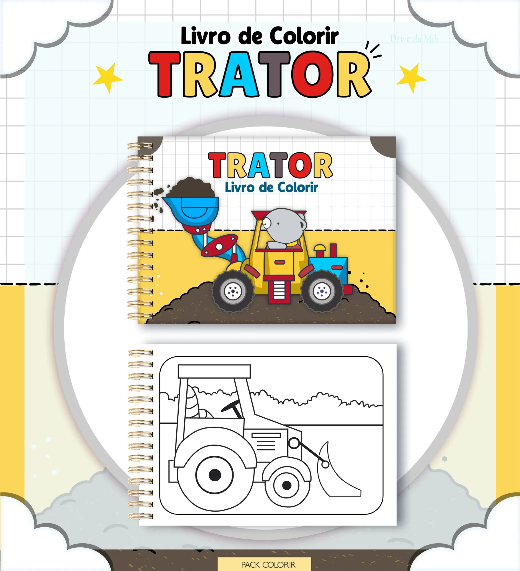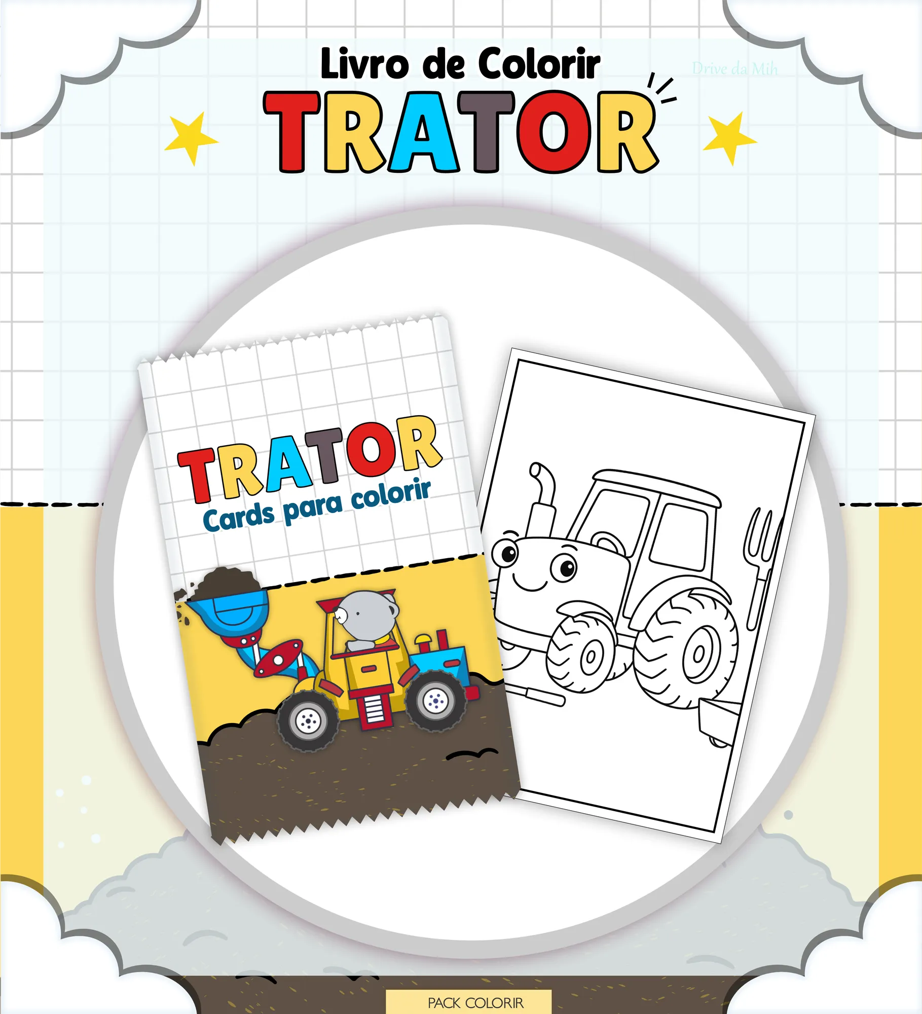 📂 **MIOLOS:** 40 páginas de miolo para colorir (PNG) com ilustrações de tratores, além de 1 arquivo de miolo completo (PDF) para facilitar a impressão.
