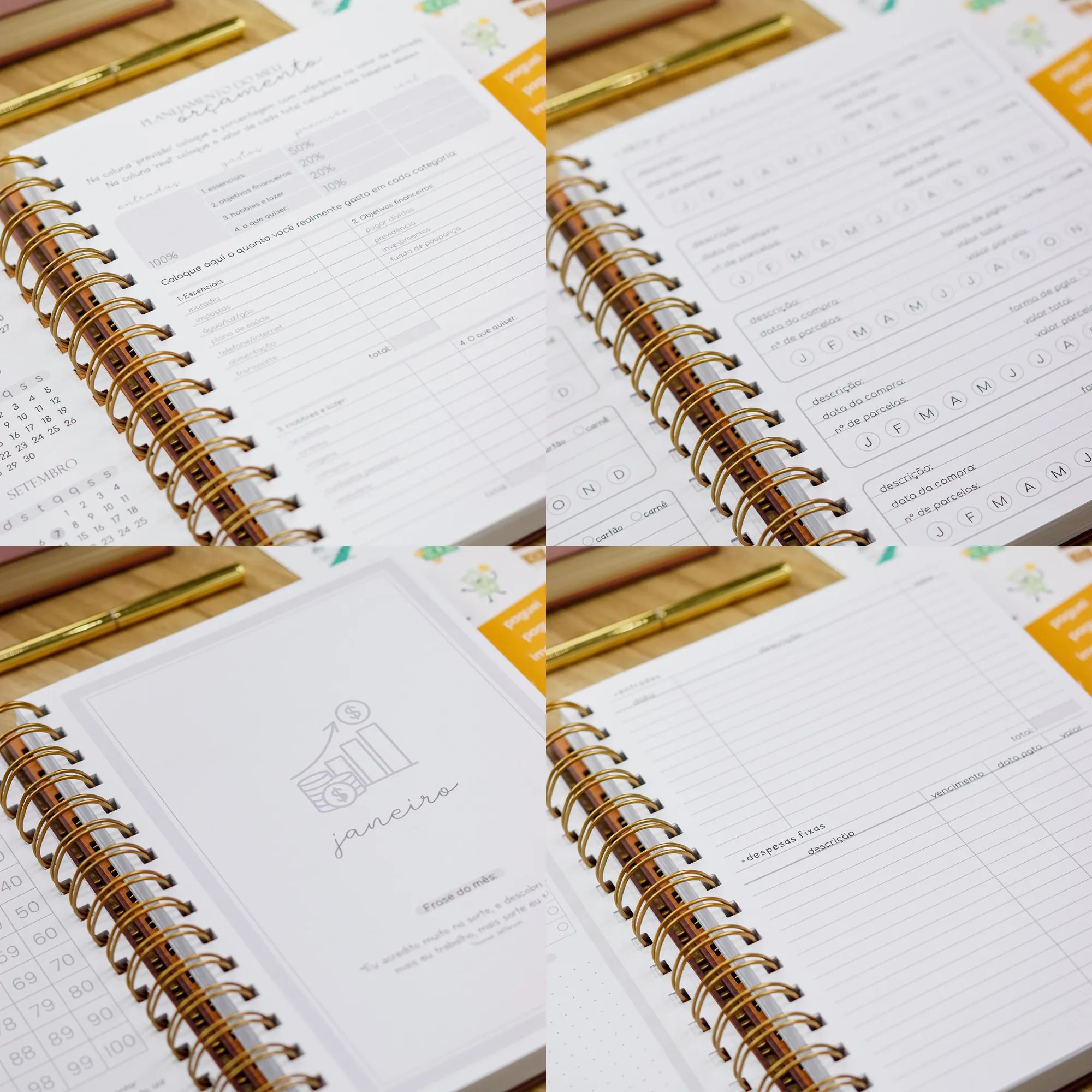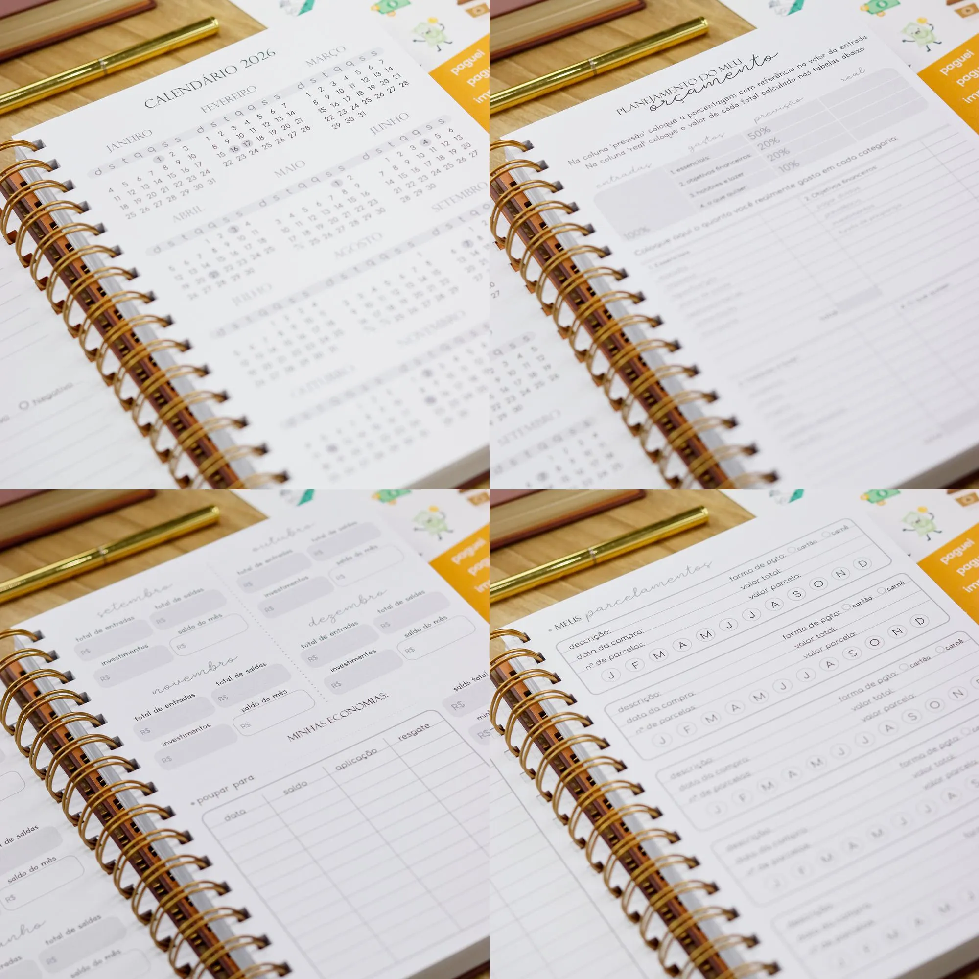 * 📂 **Miolo A5:** Miolos completos de Planner Financeiro 2026 em PDF (5 variações: Cinza, Laranja, Lilás, Rosa, Verde) e 1 página de início adicional em PDF.