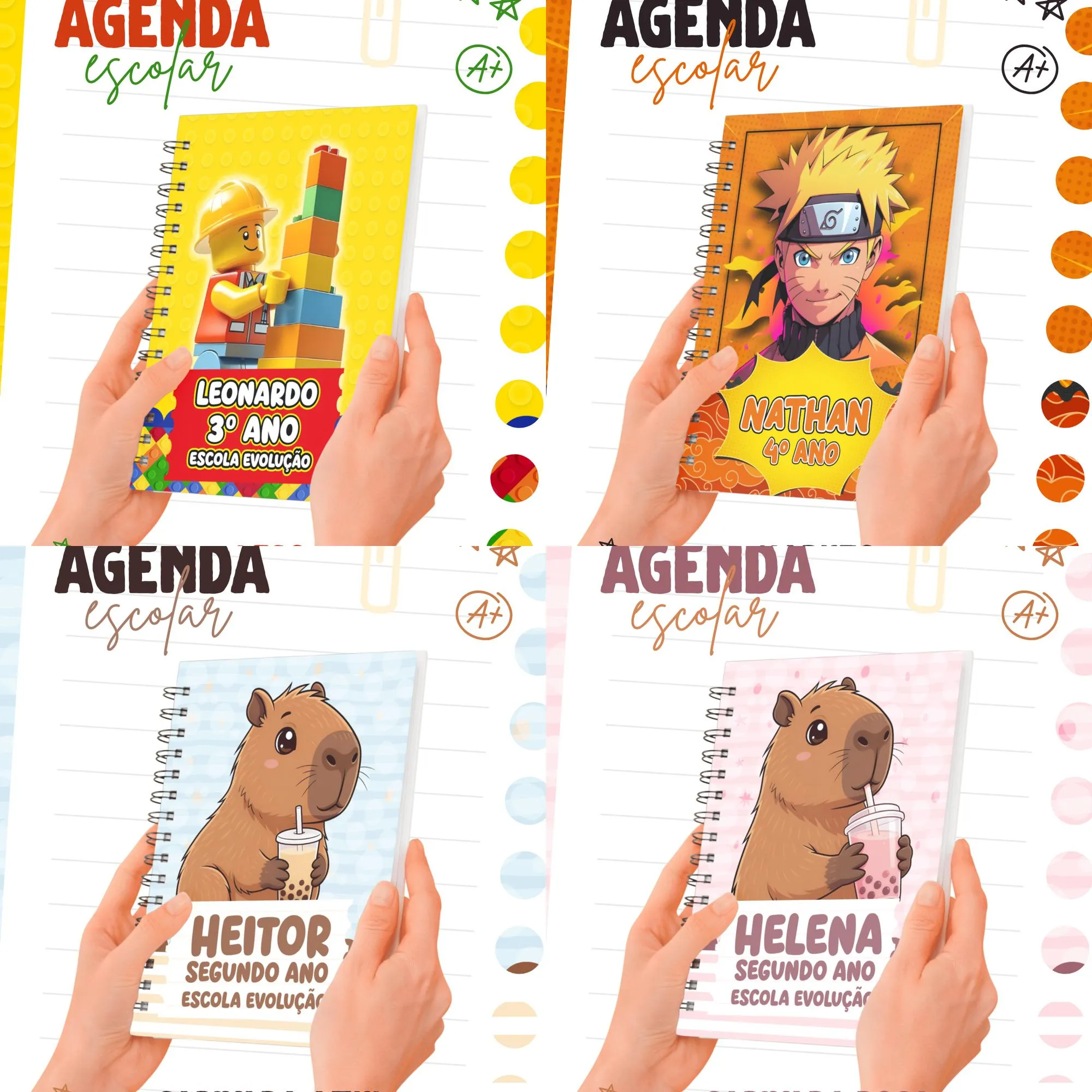 * **📂 CAPA AGENDA A5:** Contém 10 arquivos nos formatos `.PNG` e `.RAR`. Inclui 5 temas de capas para agenda A5: Capivara (Azul, Rosa), Enaldinho, Lego e Naruto.