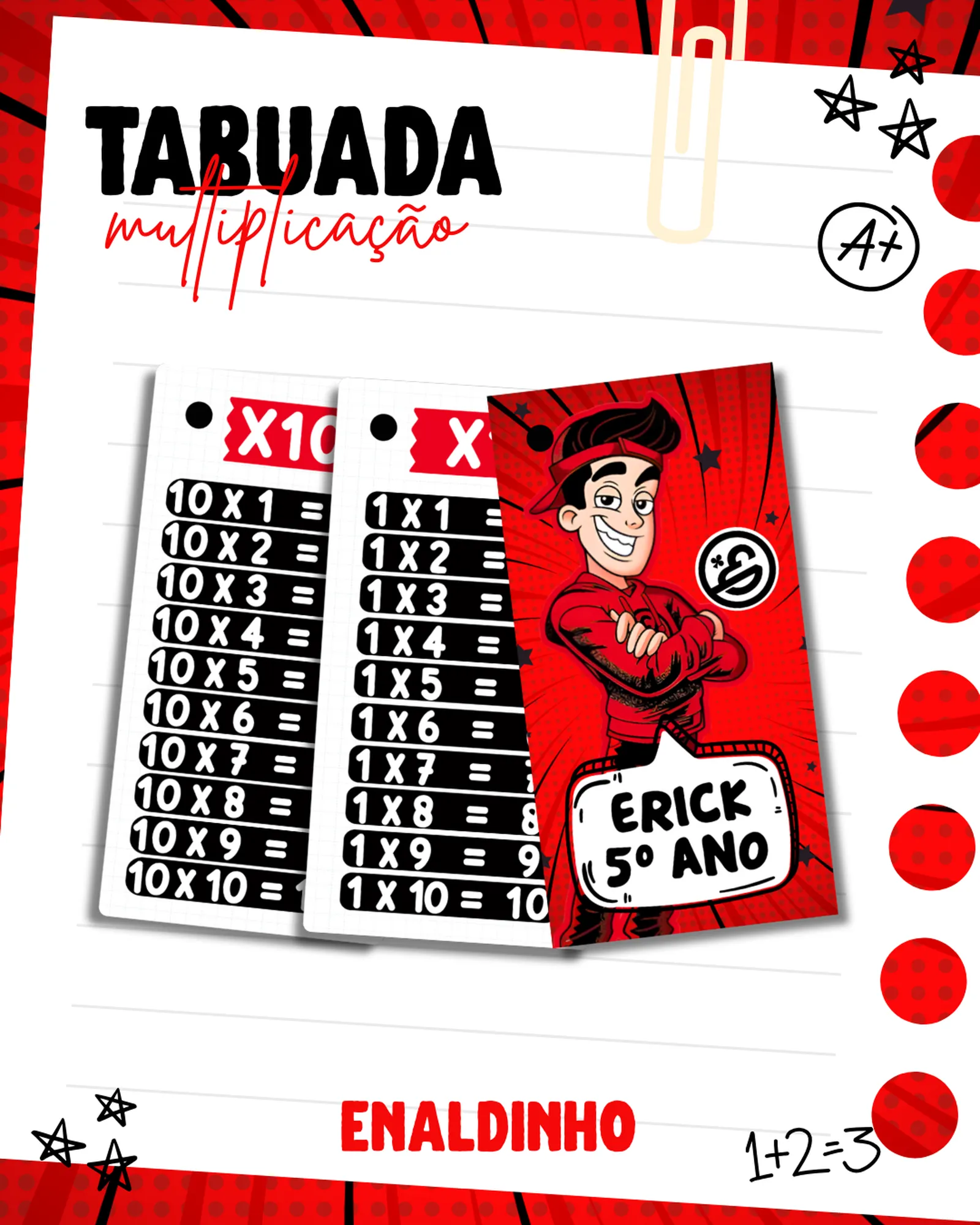 * **📂 TABUADA:** Contém 10 arquivos nos formatos `.PNG` e `.RAR`. Apresenta 5 temas de tabuadas: Capivara (Azul, Rosa), Enaldinho, Lego e Naruto.